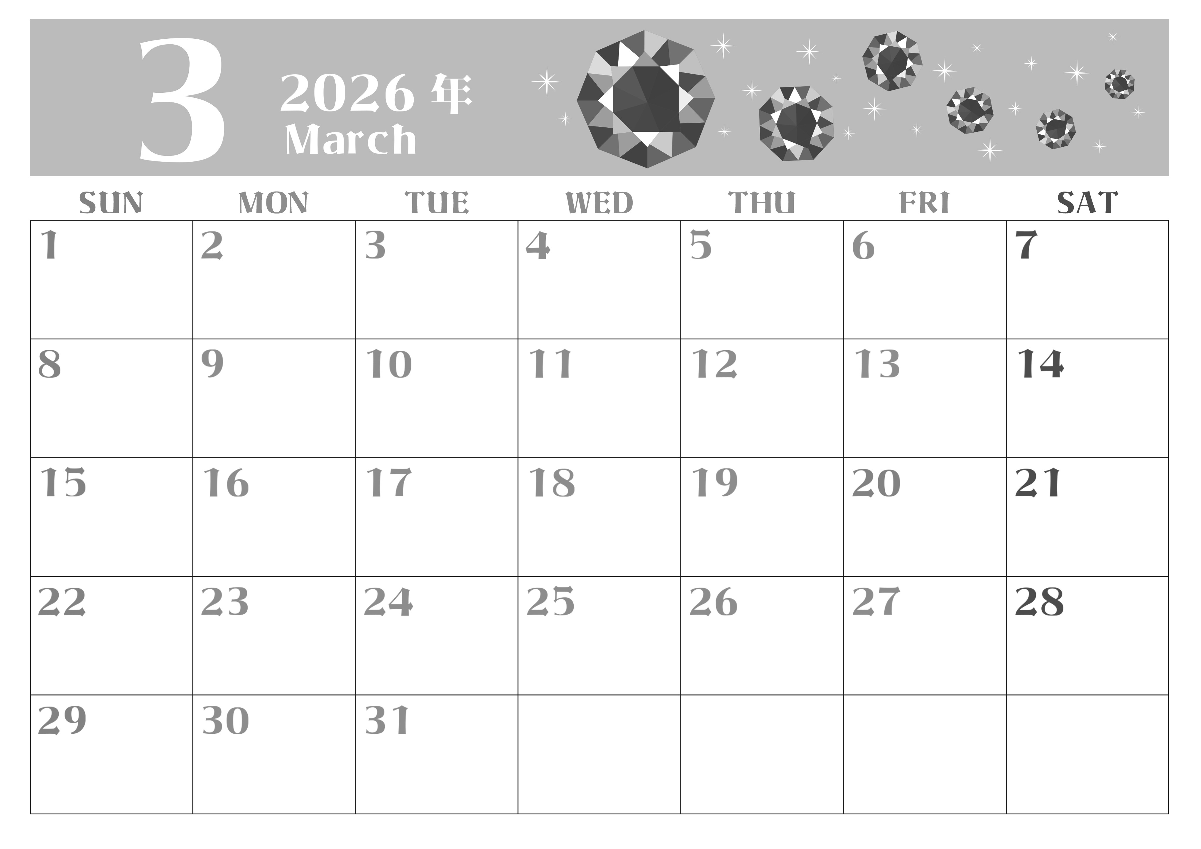 2026年3月横型モノクロの日曜始まりの無料テンプレート白黒カレンダーです。3月の誕生石であるアクアマリンの輝きが美しくておしゃれなイラスト白黒カレンダーです。3月生まれの人におすすめで大人っぽいフリー素材となっています。(2026-00460300)