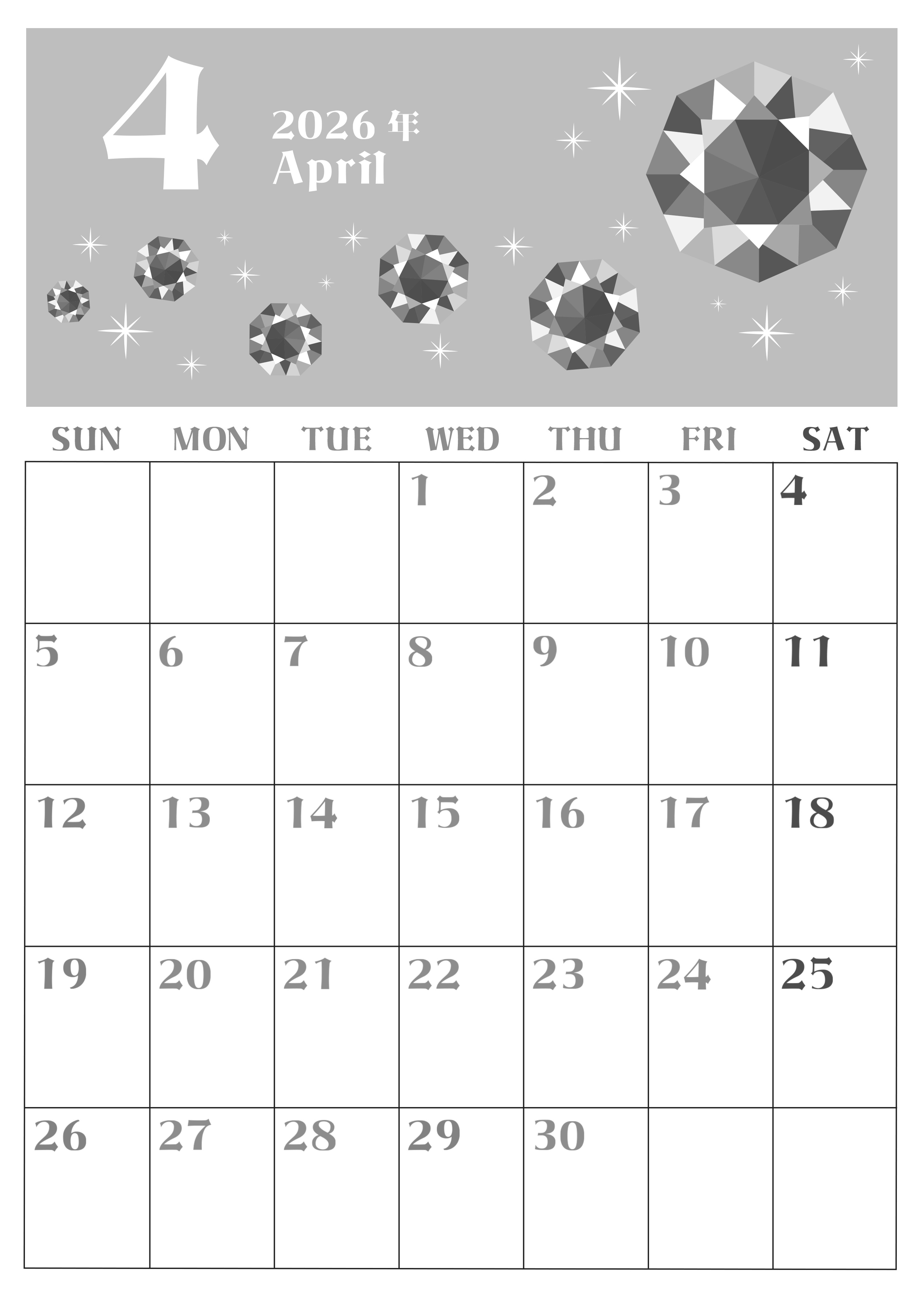 2026年・無料のカレンダーテンプレート 2026年4月縦型モノクロの日曜始まり 誕生石のイラストがおしゃれなA4無料白黒カレンダー(2026-00460410) 素材状デザイン王 2025年4月1日 2026年4月縦型モノクロの日曜始まりの無料テンプレート白黒カレンダーです。おしゃれなイラスト白黒カレンダーです。4月に輝く誕生石のダイヤモンドがちりばめられたデザインで女心をくすぐられます。(2026-00460410) 4月 縦型のカレンダー 日曜始まり 白黒 カレンダーデザイン-0046