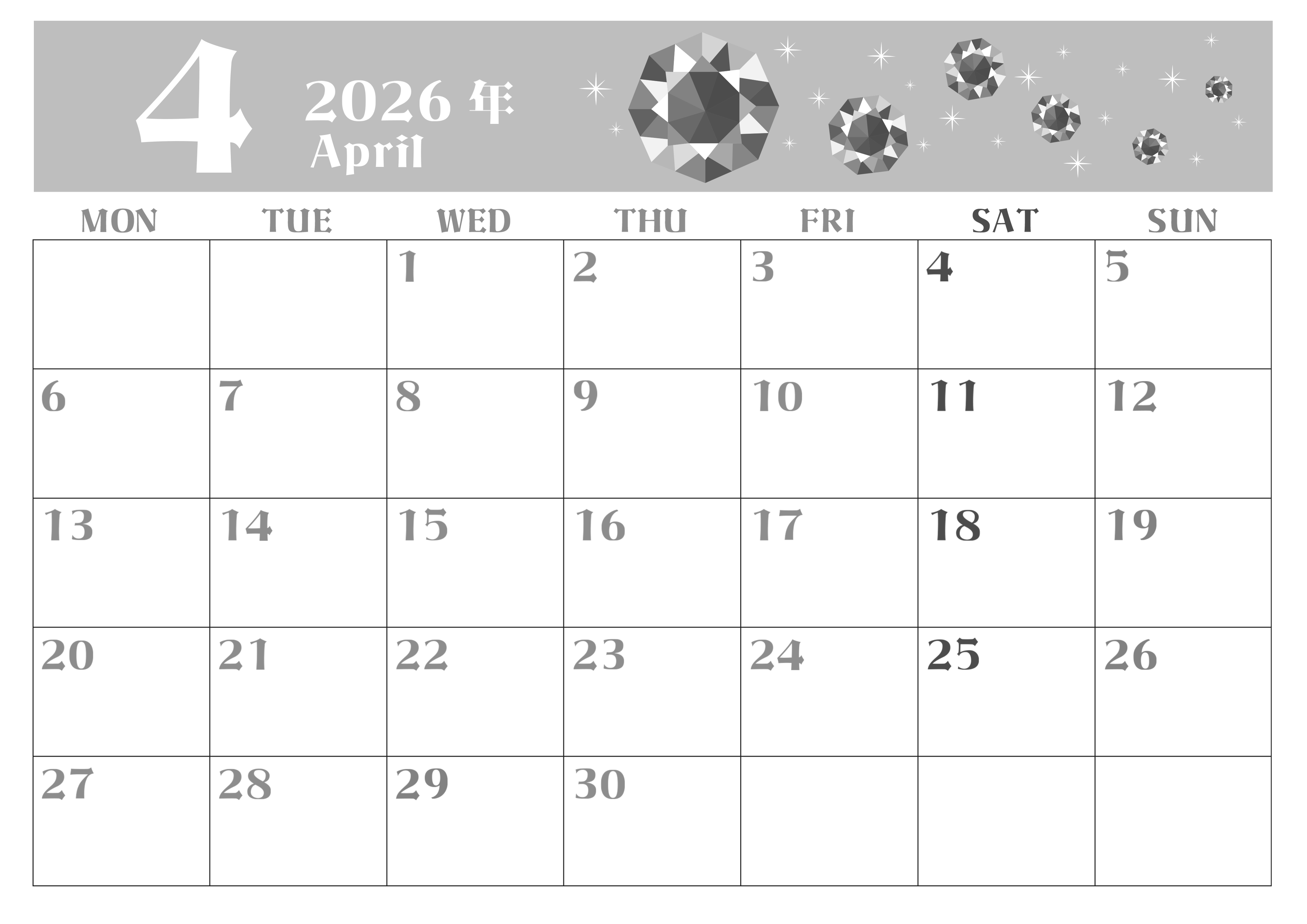 2026年4月横型モノクロの月曜始まりの無料テンプレート白黒カレンダーです。月曜始まりの白黒カレンダーを使い慣れているという人にダウンロードしてほしい4月の誕生石であるダイヤモンドのイラストがおしゃれで大人っぽいフリー素材です。(2026-00460401)