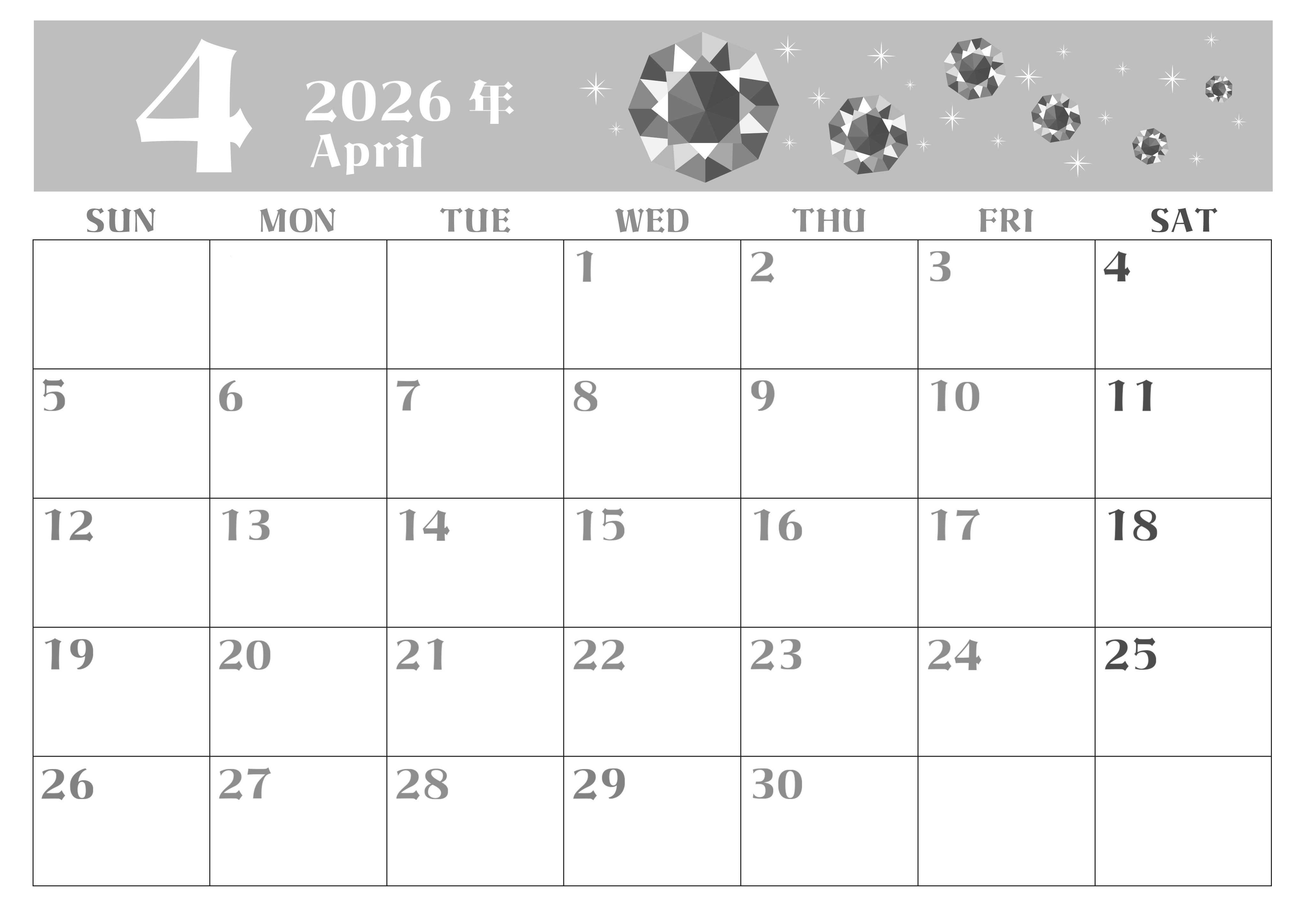 2026年4月横型モノクロの日曜始まりの無料テンプレート白黒カレンダーです。4月の誕生石であるダイヤモンドのイラストが美しくおしゃれな大人っぽいイラストがあしらわれたシックな無料白黒カレンダーです。(2026-00460400)