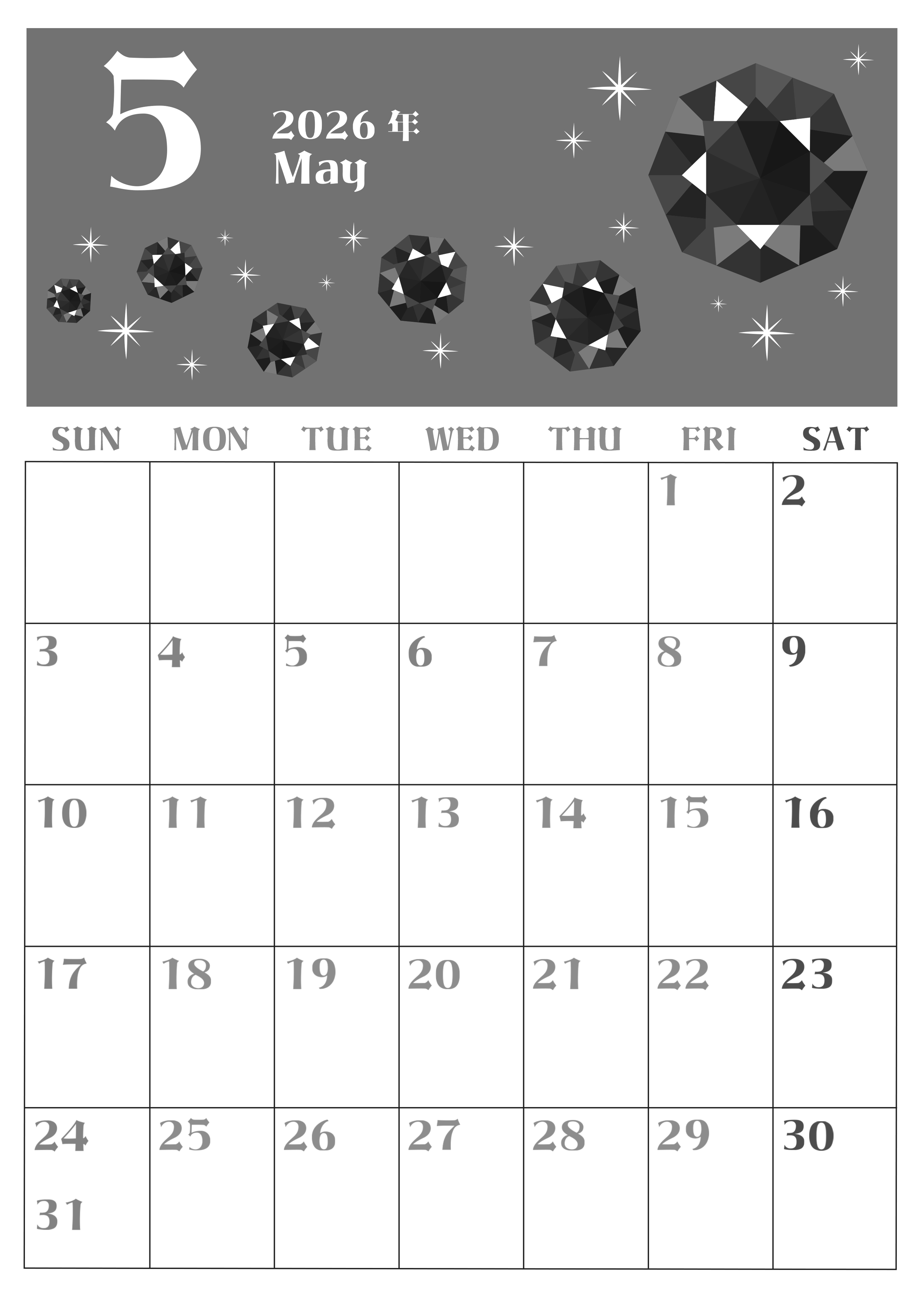 2026年5月縦型モノクロの日曜始まりの無料テンプレート白黒カレンダーです。おしゃれな誕生石のイラスト白黒カレンダーを用意しました。白黒カレンダー部分は余白がたっぷりあるので書き込みがしやすいです。(2026-00460510)