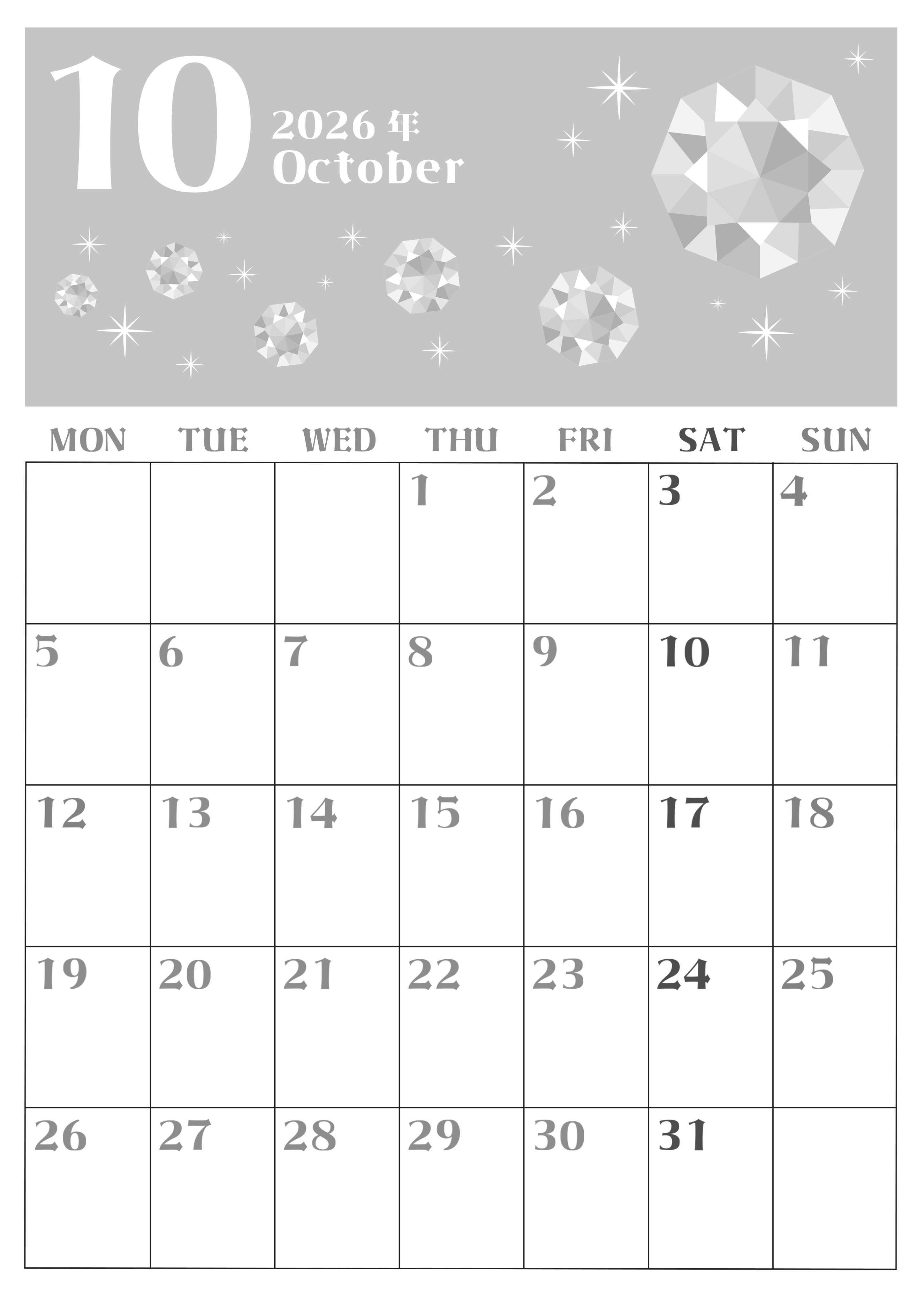 2026年10月縦型モノクロの月曜始まり 誕生石のイラストがおしゃれなA4無料白黒カレンダー(2026-00461011)