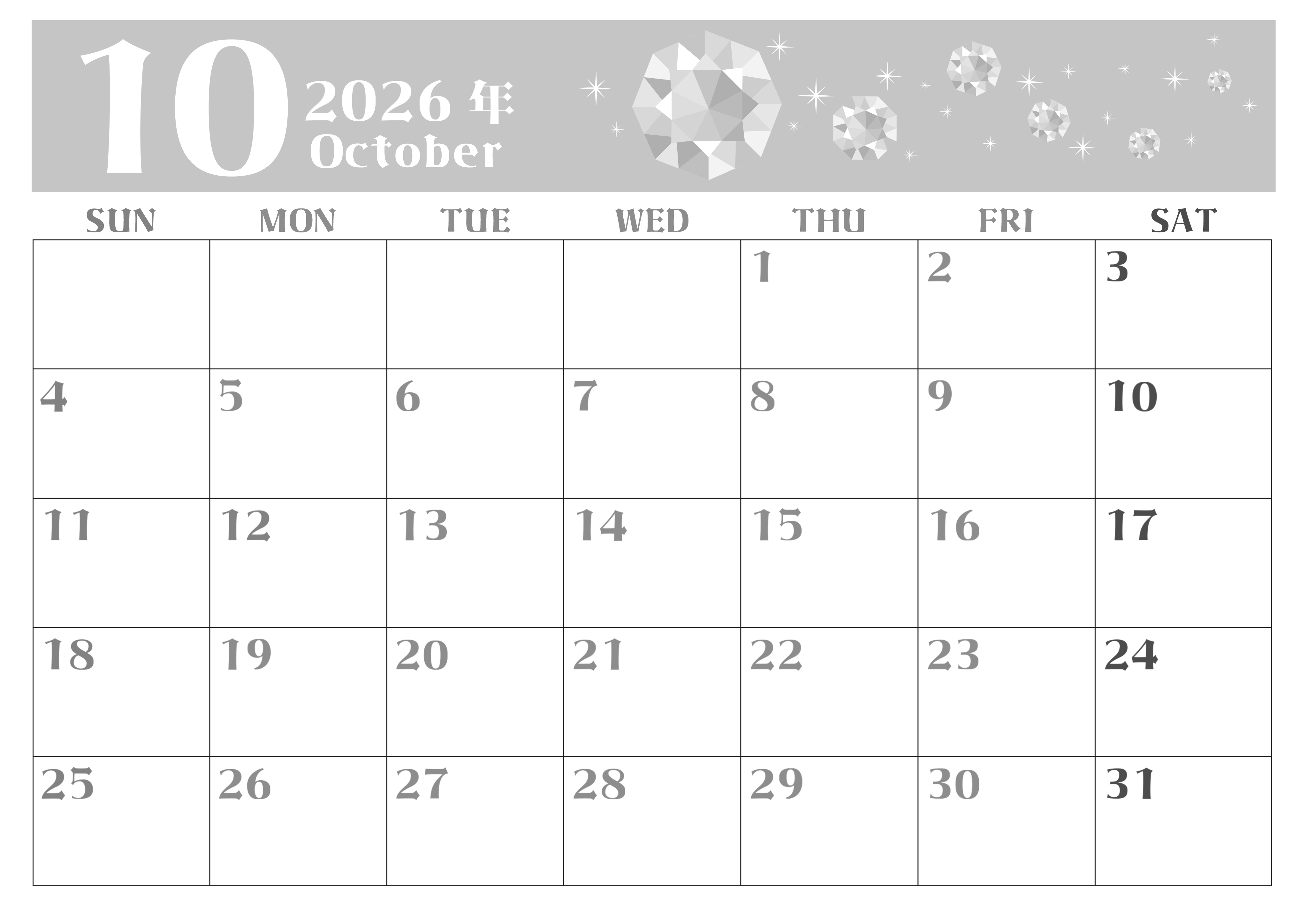 2026年10月横型モノクロの日曜始まり 誕生石のイラストがおしゃれなA4無料白黒カレンダー(2026-00461000)