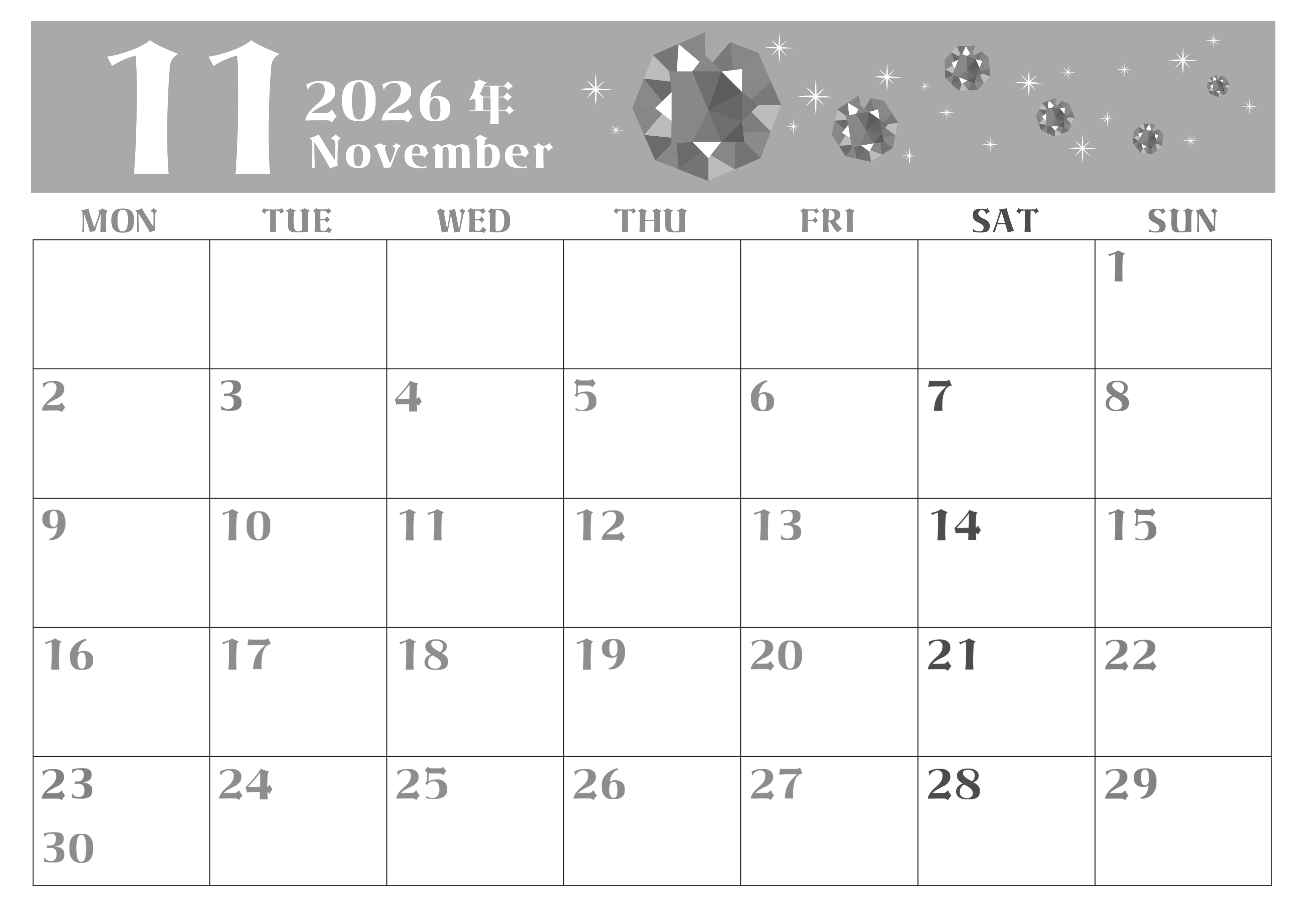 2026年11月横型モノクロの月曜始まり 誕生石のイラストがおしゃれなA4無料白黒カレンダー(2026-00461101)