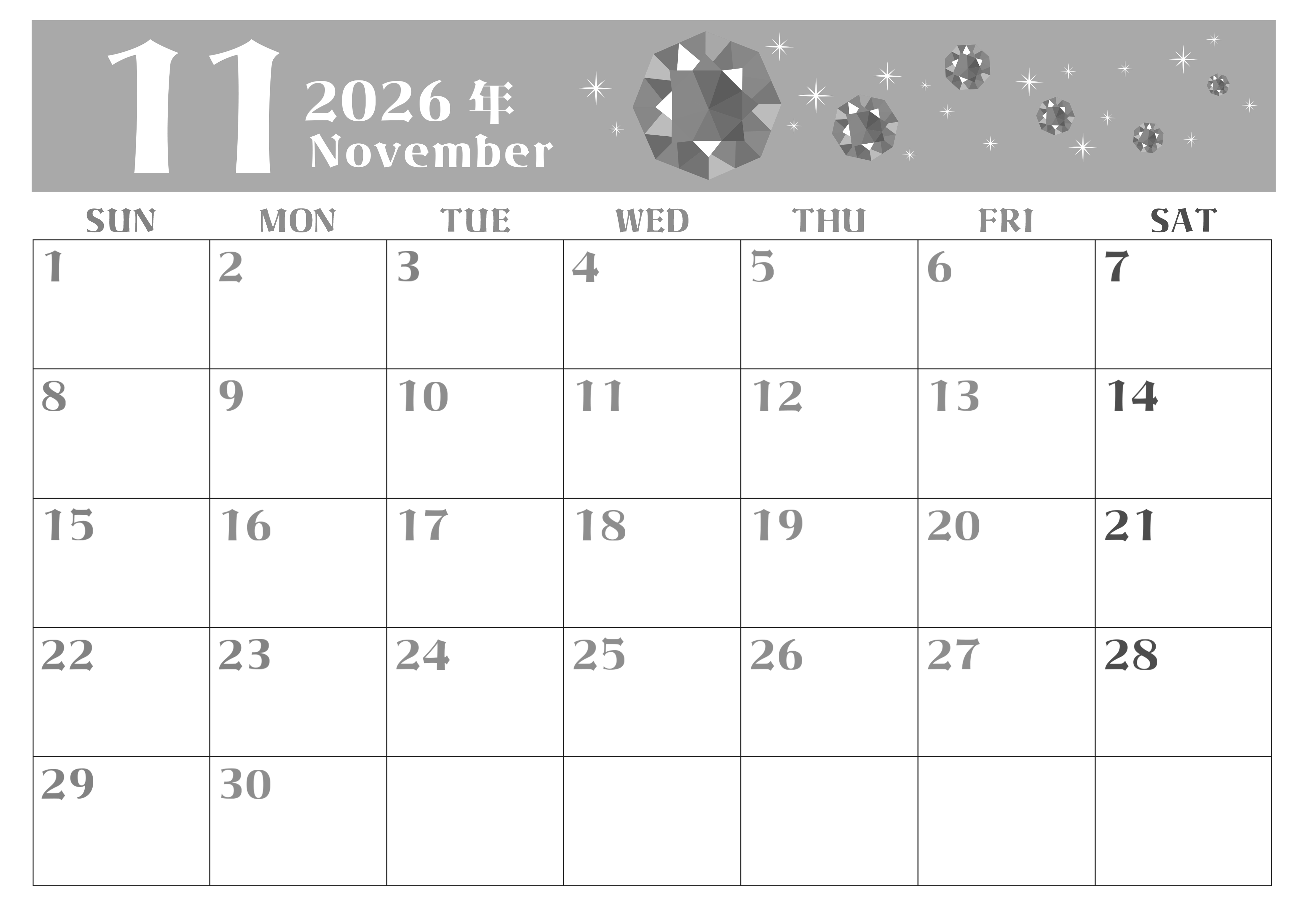 2026年11月横型モノクロの日曜始まりの無料テンプレート白黒カレンダーです。11月の誕生石であるトパーズのイラストがスタイリッシュかつおしゃれで気品のある白黒カレンダーです。目に優しいデザインです。(2026-00461100)