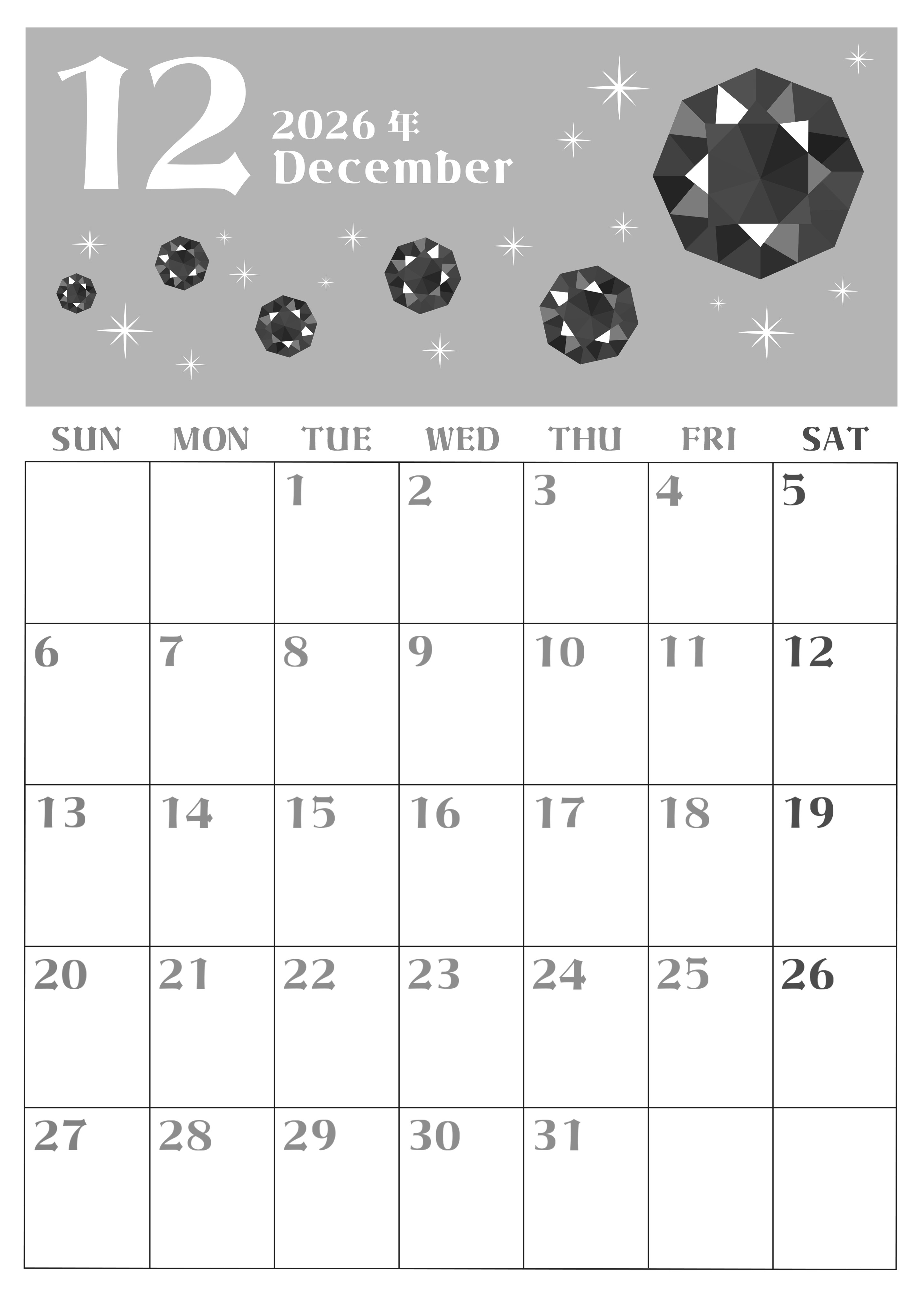 2026年12月縦型モノクロの日曜始まりの無料テンプレート白黒カレンダーです。誕生石をテーマにしたおしゃれな無料白黒カレンダーです。12月の誕生石はラピスラズリという名前です。曜日ごとに日付の色分けがされているので使いやすさもばっちりです。(2026-00461210)