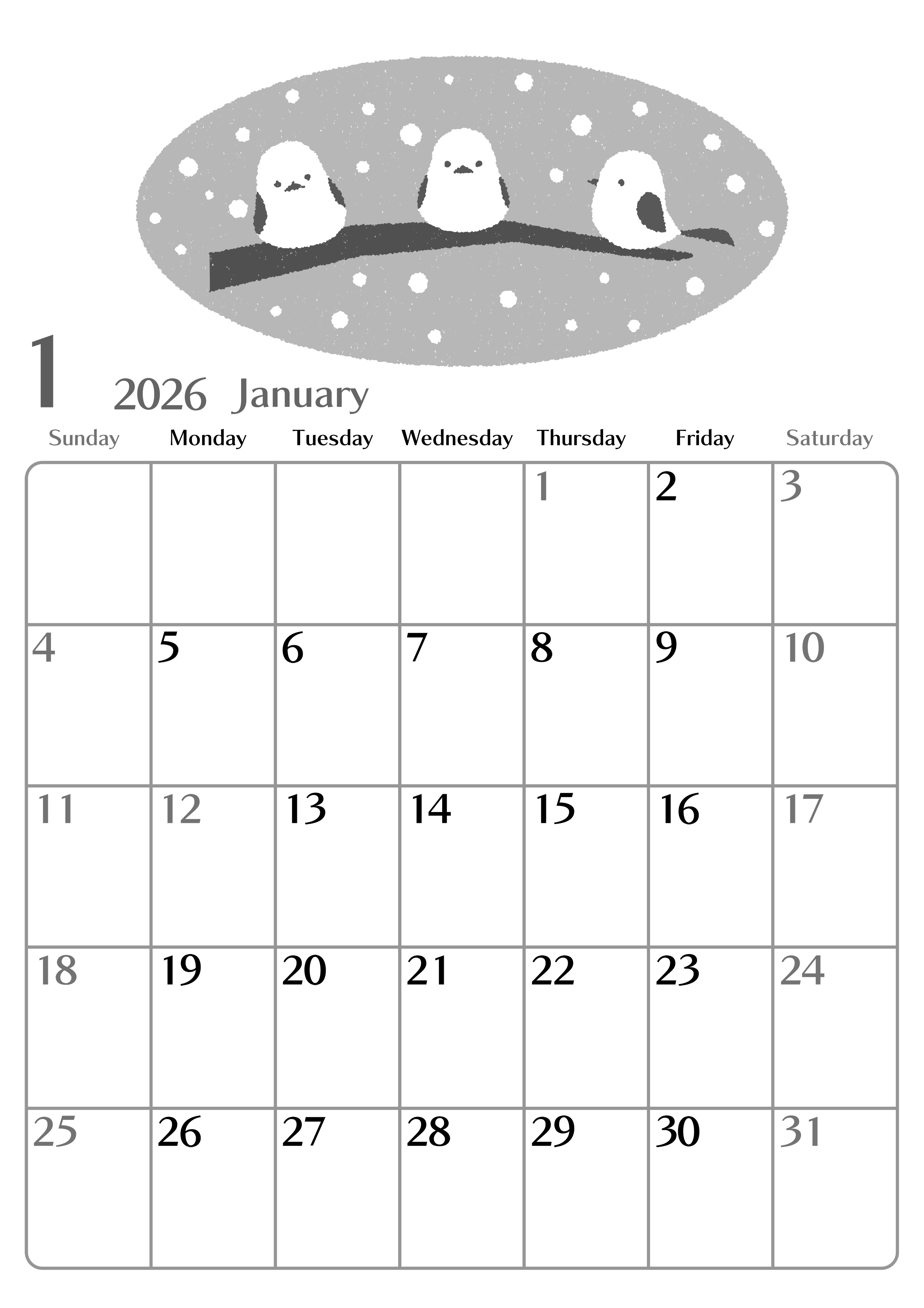 2026年1月縦型モノクロの日曜始まり イラストのおしゃれA4無料白黒カレンダー(2026-00470110)