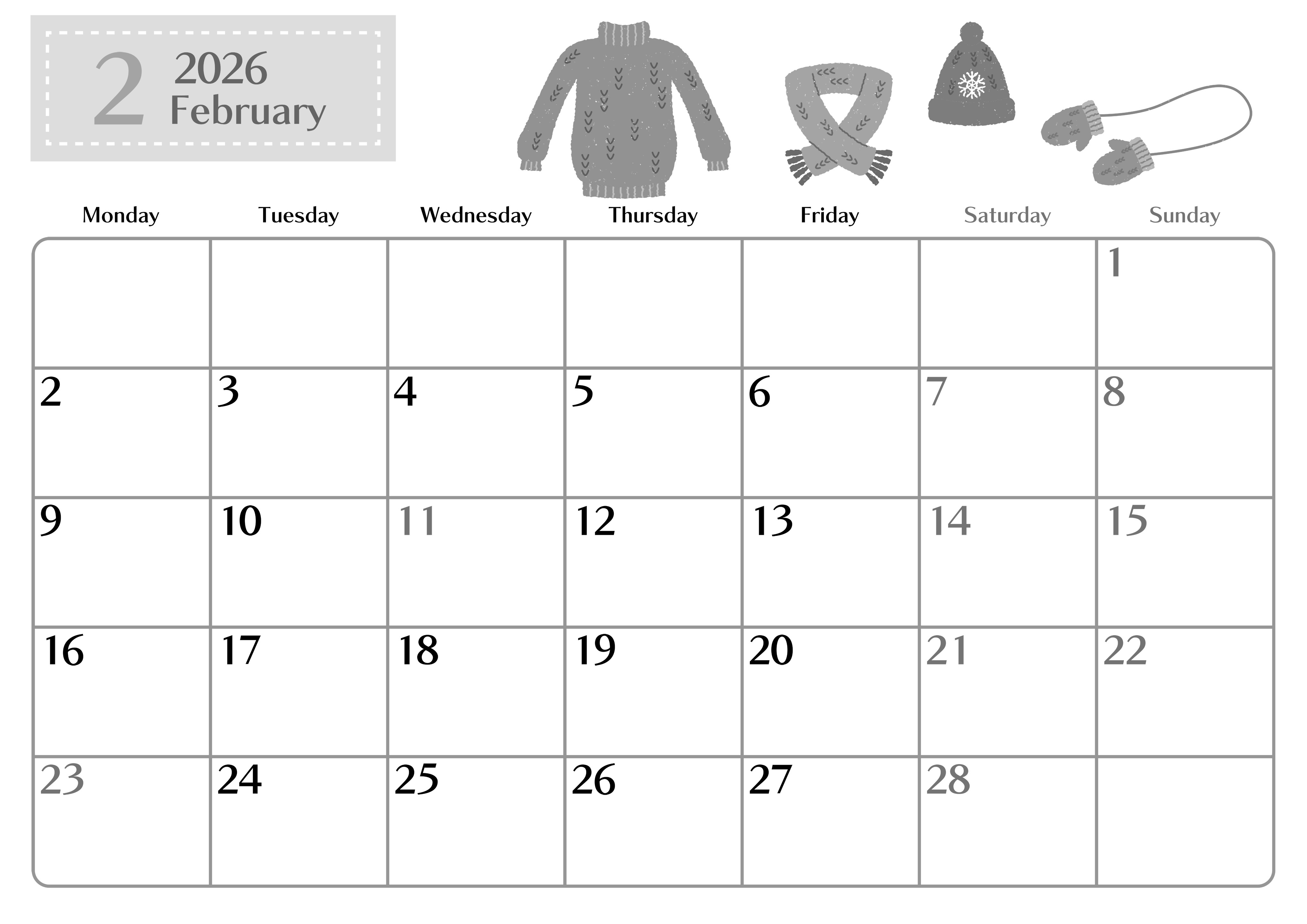 2026年・無料のカレンダーテンプレート 2026年2月横型モノクロの月曜始まり イラストのおしゃれA4無料白黒カレンダー(2026-00470201) 素材状デザイン王 2025年4月1日 2026年2月横型モノクロの月曜始まりの無料テンプレート白黒カレンダーです。真冬の寒さを吹き飛ばしてくれるようなおしゃれで見やすいカレンダーとなっています。(2026-00470201) 2月 横型のカレンダー 月曜始まり 白黒 カレンダーデザイン-0047