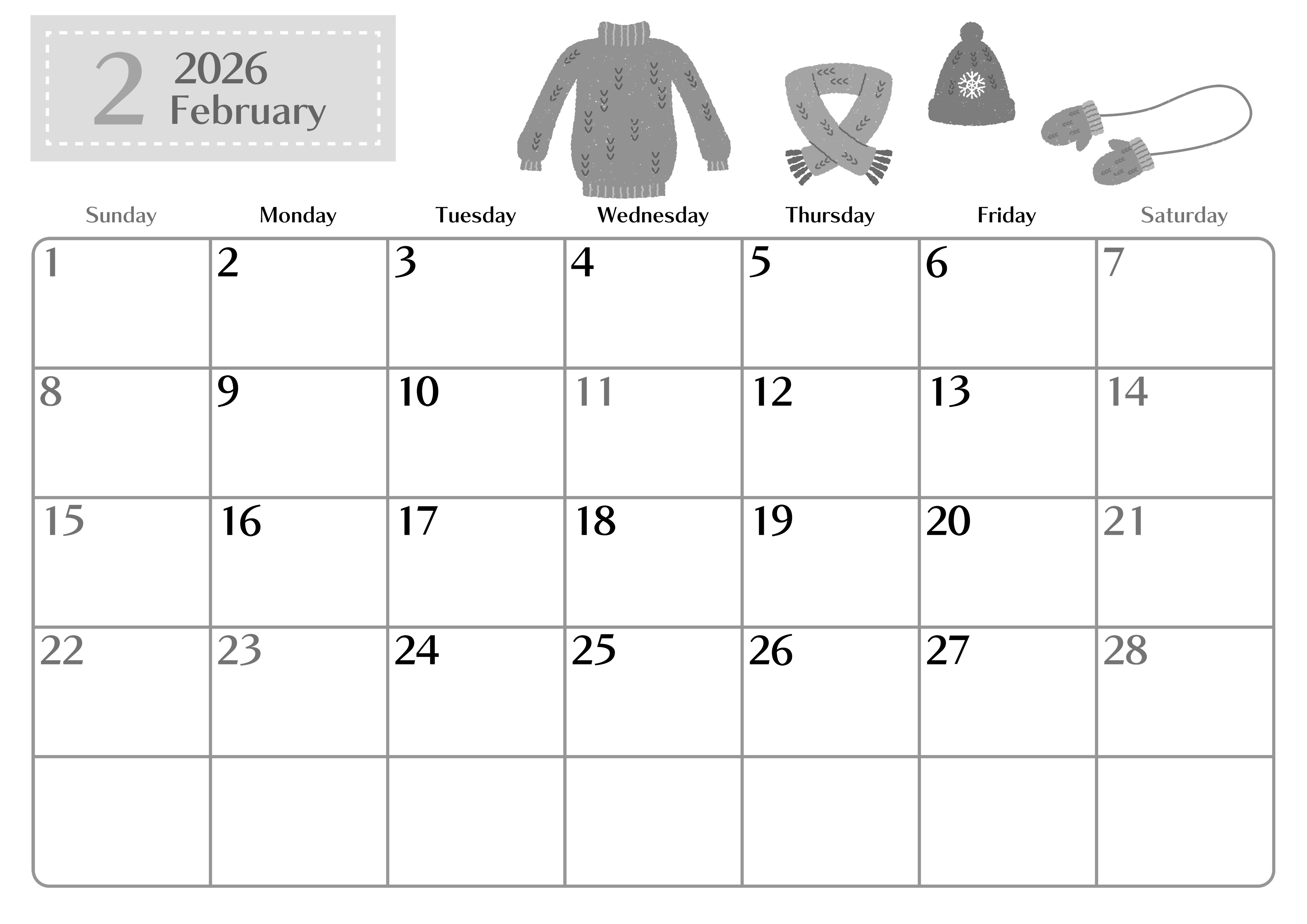 2026年2月横型モノクロの日曜始まりの無料テンプレート白黒カレンダーです。マフラーやセーターや手袋といった暖をとるためのウェアを散りばめたイラストがおしゃれです。余白もたっぷりあるので実用性も高い白黒カレンダーとなっています。(2026-00470200)