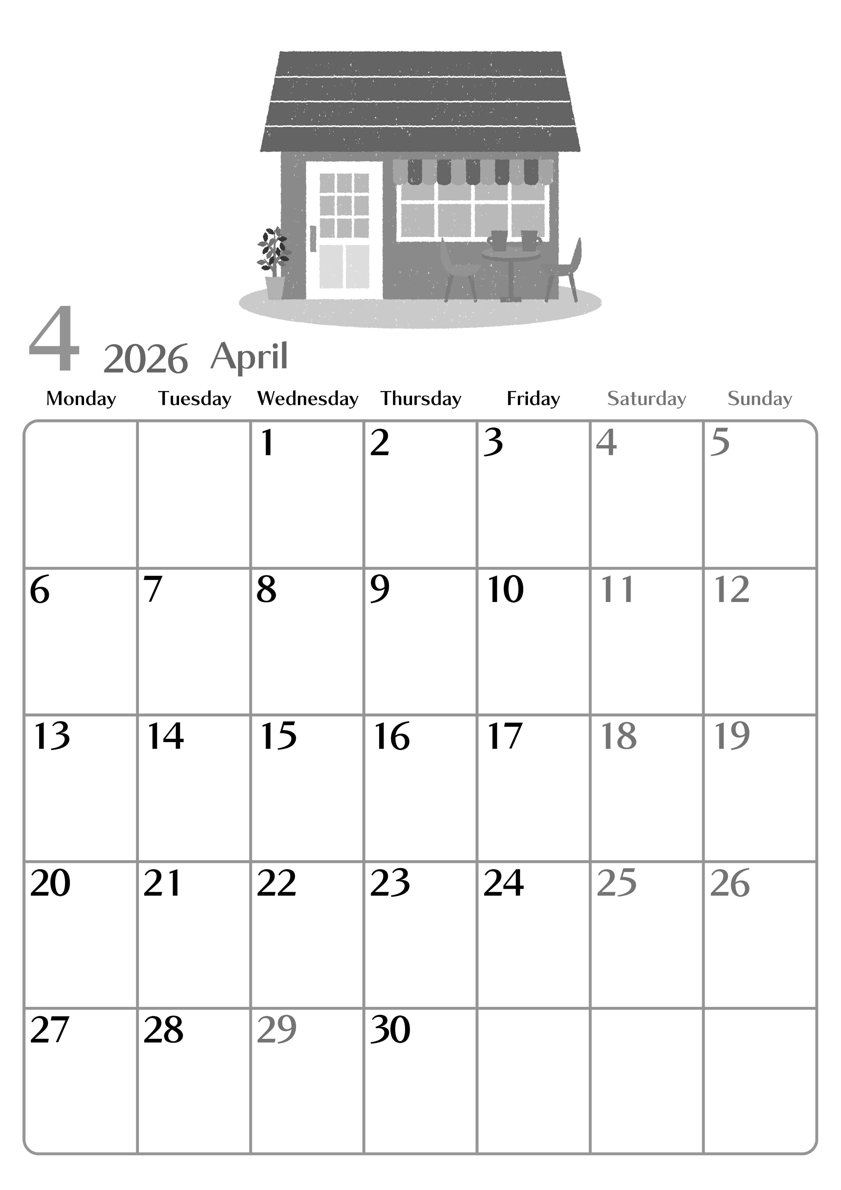 2026年4月縦型モノクロの月曜始まりの無料テンプレート白黒カレンダーです。縦型レイアウトの白黒カレンダーなので壁に画鋲で貼ってスケジュールを見える化するために便利です。新生活を思わせるお家のイラストもシンプルでおしゃれなワンポイントです。(2026-00470411)