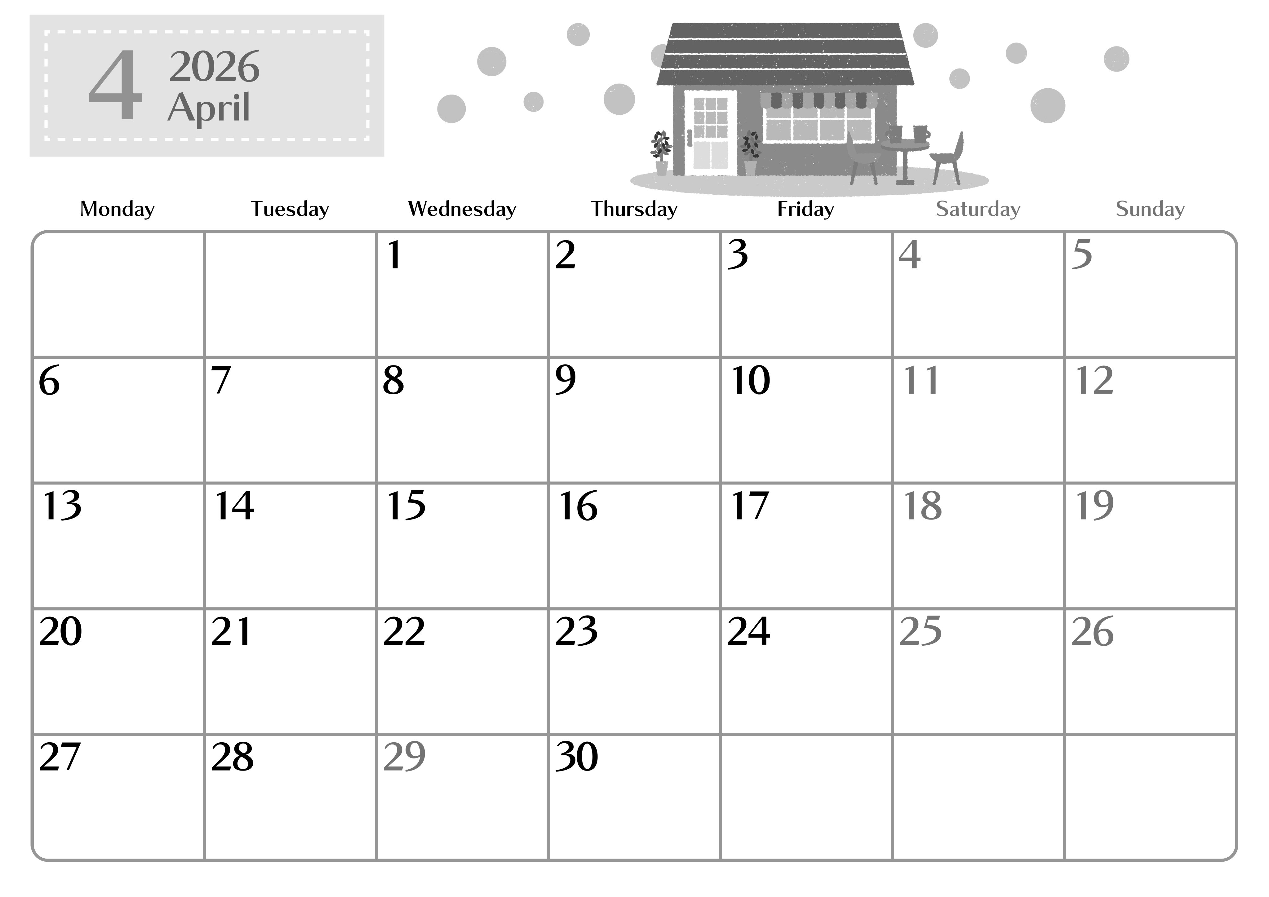 2026年4月横型モノクロの月曜始まりの無料テンプレート白黒カレンダーです。上品でおしゃれなフォントが特徴の白黒カレンダー部分が見やすいのはもちろん、イラスト部分の一軒家が小綺麗で快適な新生活に期待感を高めてくれるような使いたくなるデザインです。(2026-00470401)