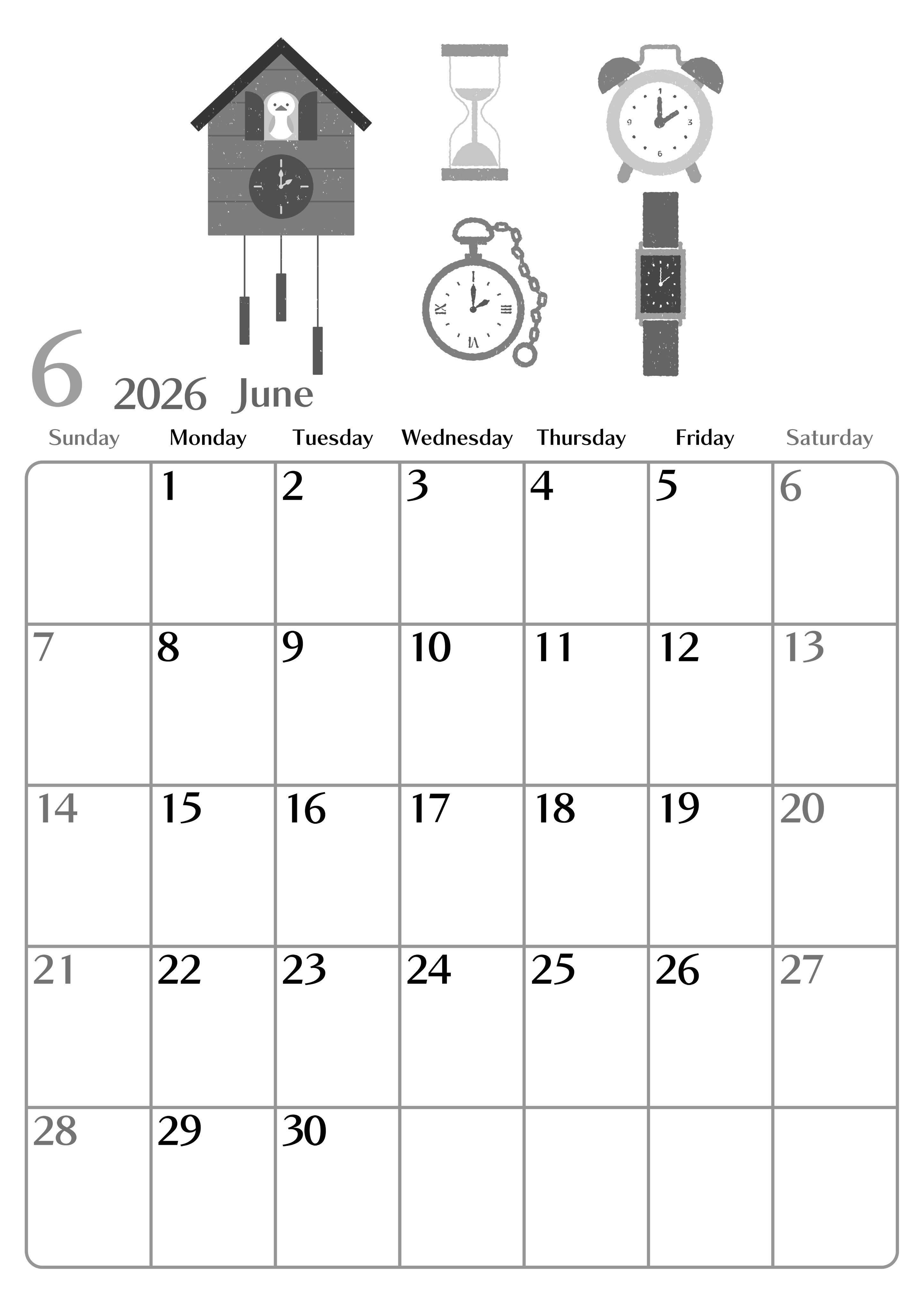 2026年6月縦型モノクロの日曜始まりの無料テンプレート白黒カレンダーです。砂時計や腕時計や掛け時計、あなたはどのタイプの時計が好きですか?おしゃれで縦型モノクロのイラスト付きの白黒カレンダーなので壁に貼って使うのをおすすめします。(2026-00470610)