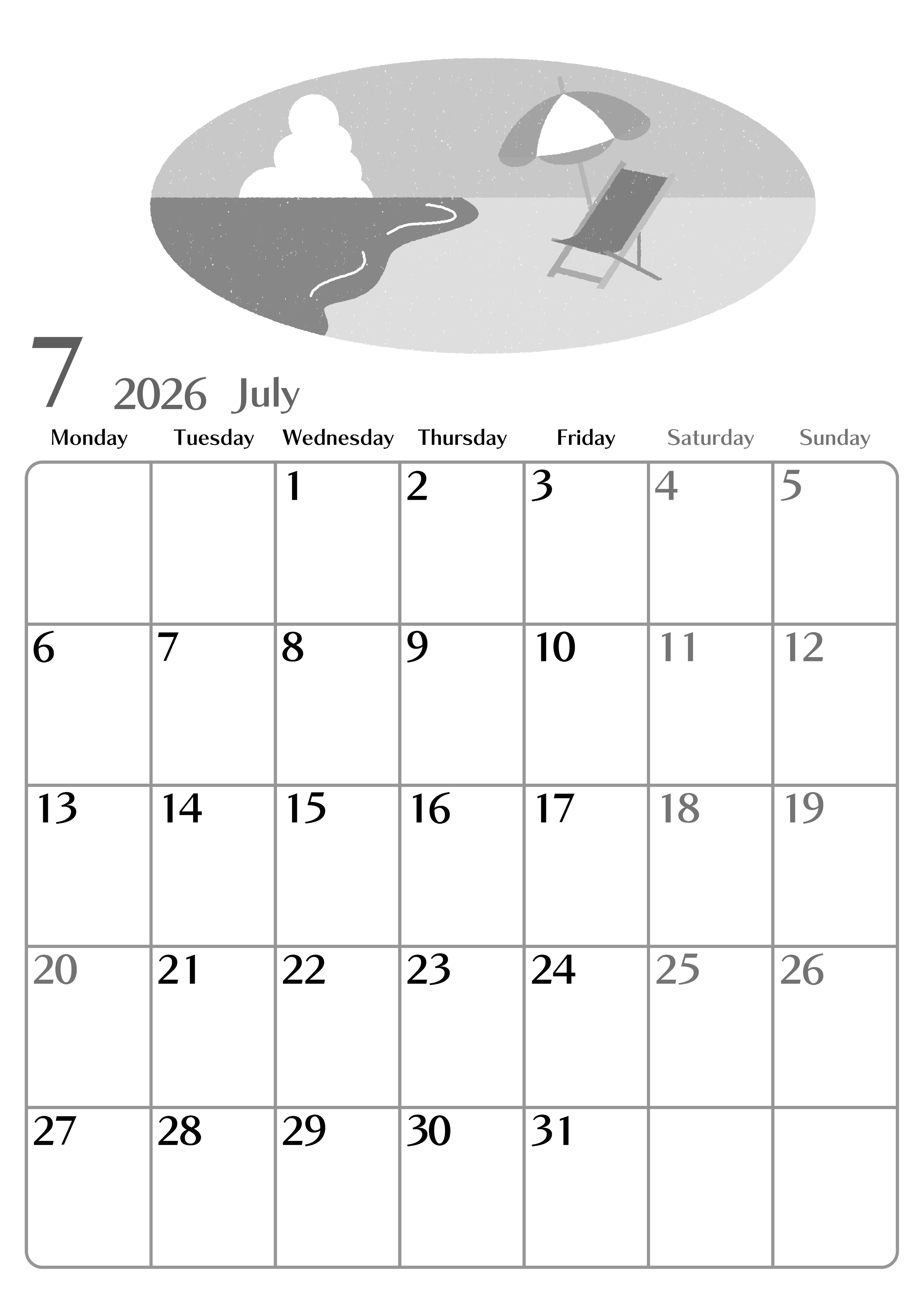 2026年7月縦型モノクロの月曜始まり  バカンスイラストのおしゃれA4無料白黒カレンダー(2026-00470711)