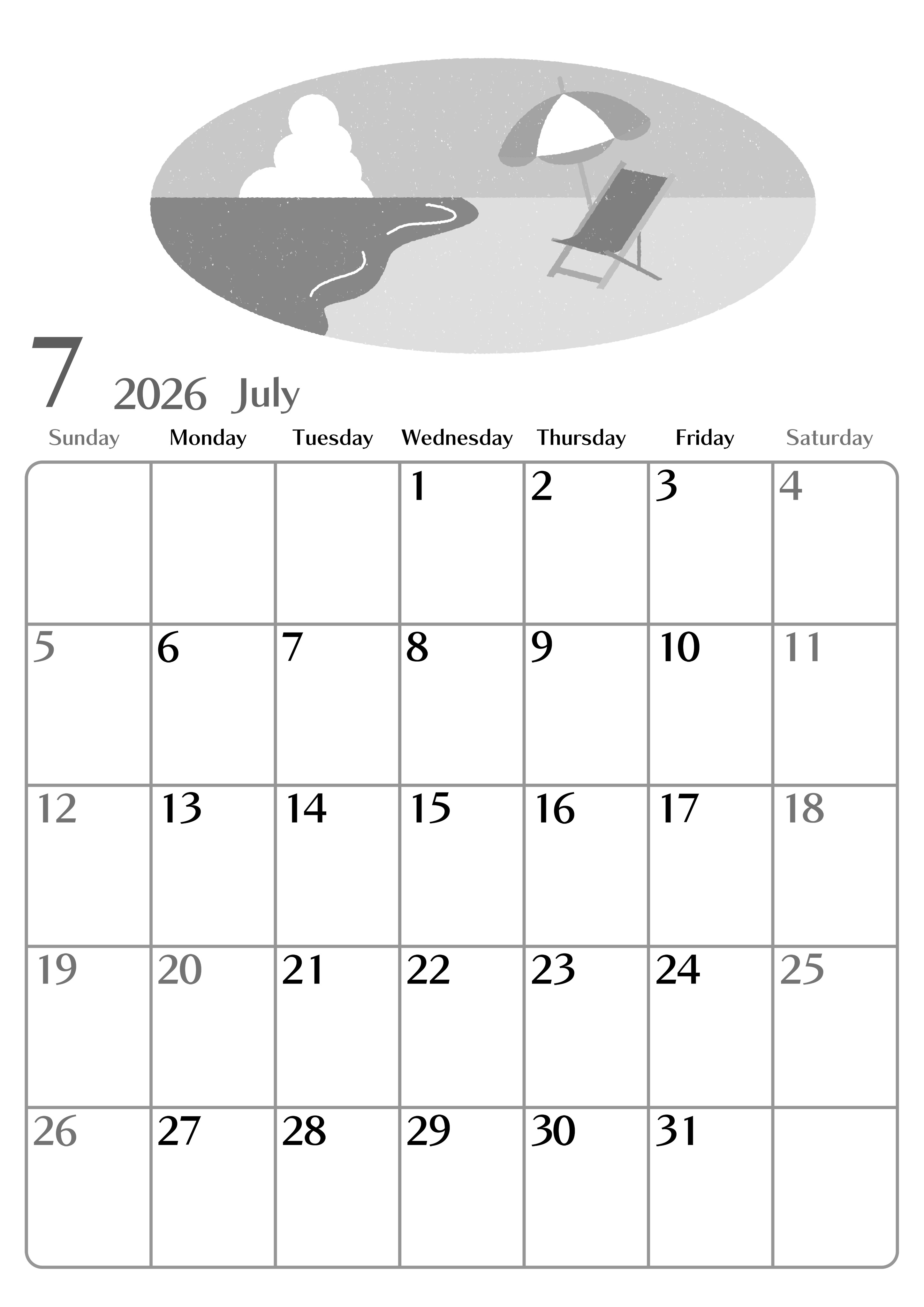 2026年7月縦型モノクロの日曜始まりの無料テンプレート白黒カレンダーです。南国 バカンスをテーマにしたおしゃれなイラストが添えらえれている縦型でスケジュールをたっぷり書き込めるようなレイアウトのフリー素材です。(2026-00470710)
