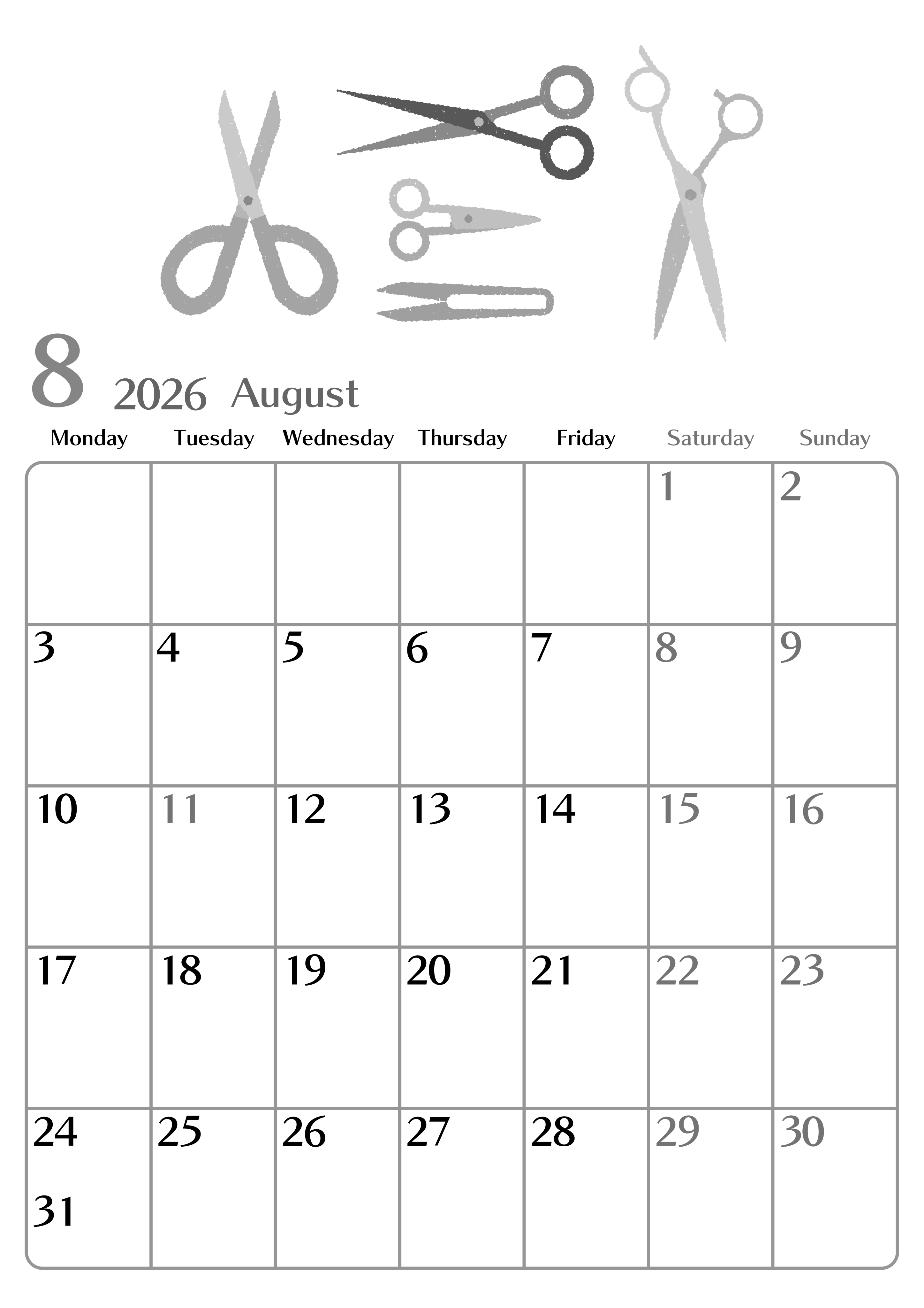 2026年8月縦型モノクロの月曜始まりの無料テンプレート白黒カレンダーです。月曜始まりなのでサラリーマンや学生さんにとって使いやすい白黒カレンダーです。ハサミのイラストもおしゃれでありながらも目立ちすぎないので使いやすいです。(2026-00470811)