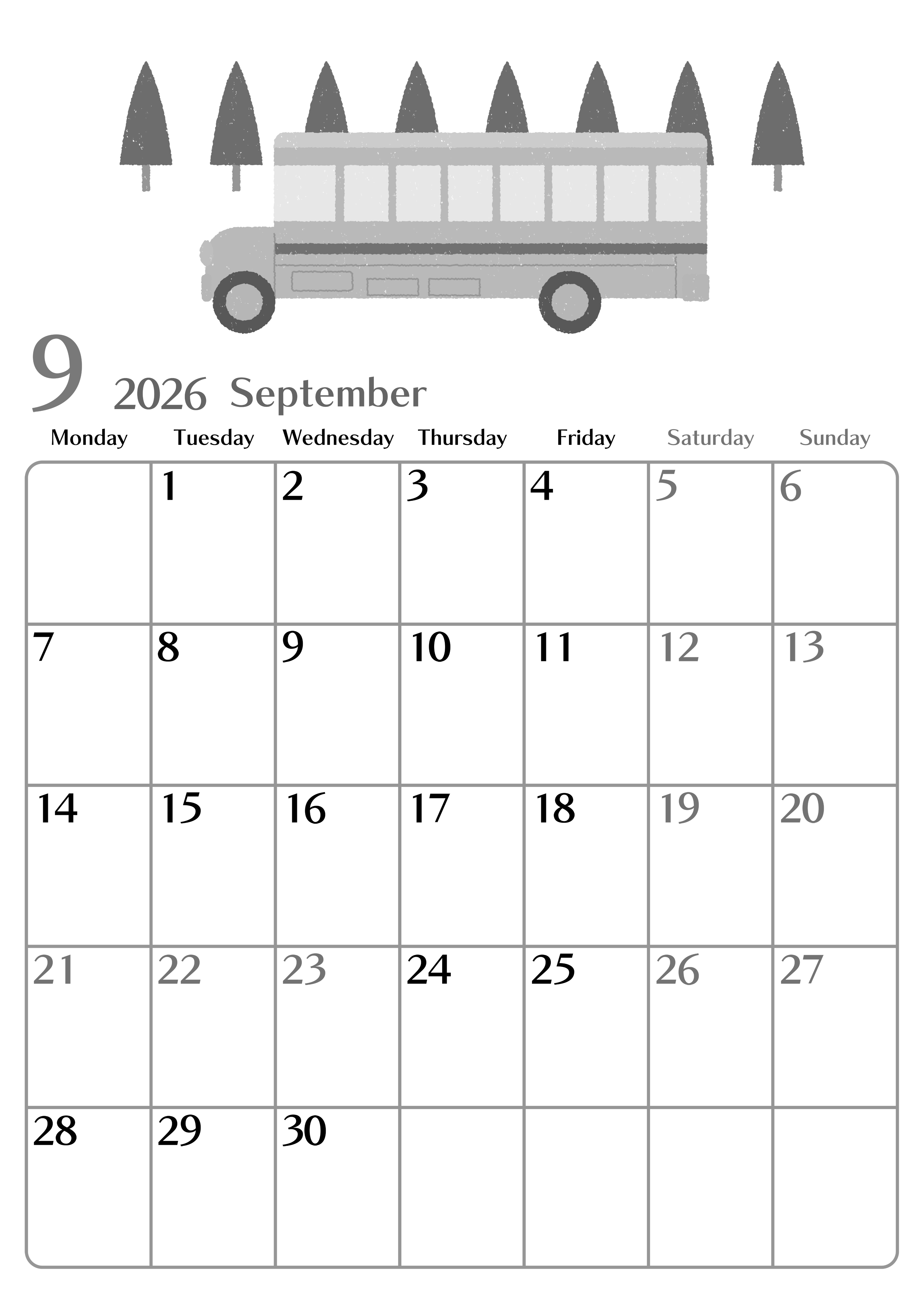 2026年9月縦型モノクロの月曜始まりの無料テンプレート白黒カレンダーです。新学期の勉強の予定を整理整頓して書き込むのにも向いているだけでなく、白黒カレンダー上部のバスのイラストがおとなっぽいおしゃれさを醸し出しています。(2026-00470911)