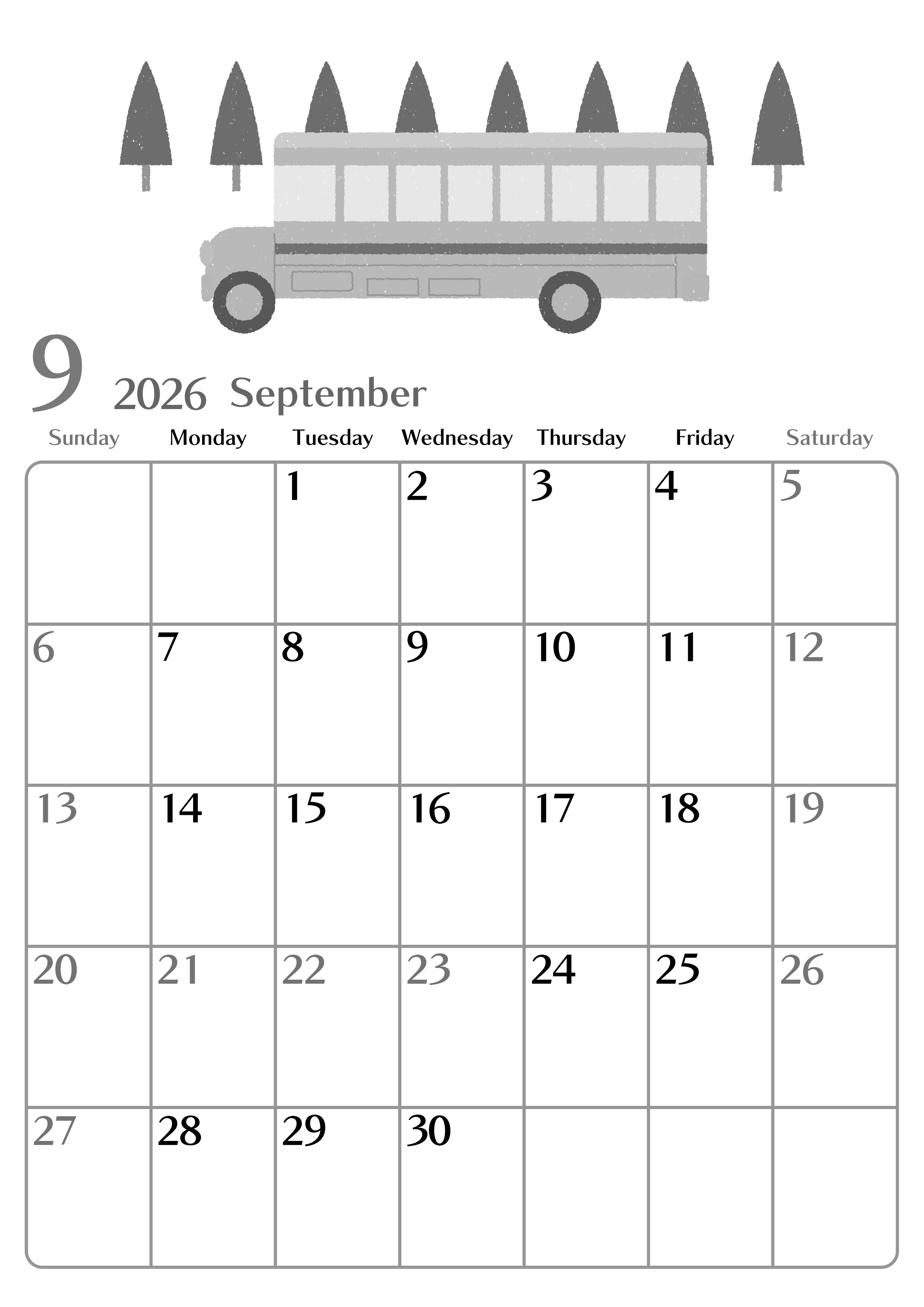 2026年9月縦型モノクロの日曜始まりの無料テンプレート白黒カレンダーです。夏休み明けの憂鬱な気持ちを吹き飛ばしてくれるような軽快でおしゃれなバスのイラストが添えられている縦型モノクロの見やすいレイアウトの白黒カレンダーです。(2026-00470910)