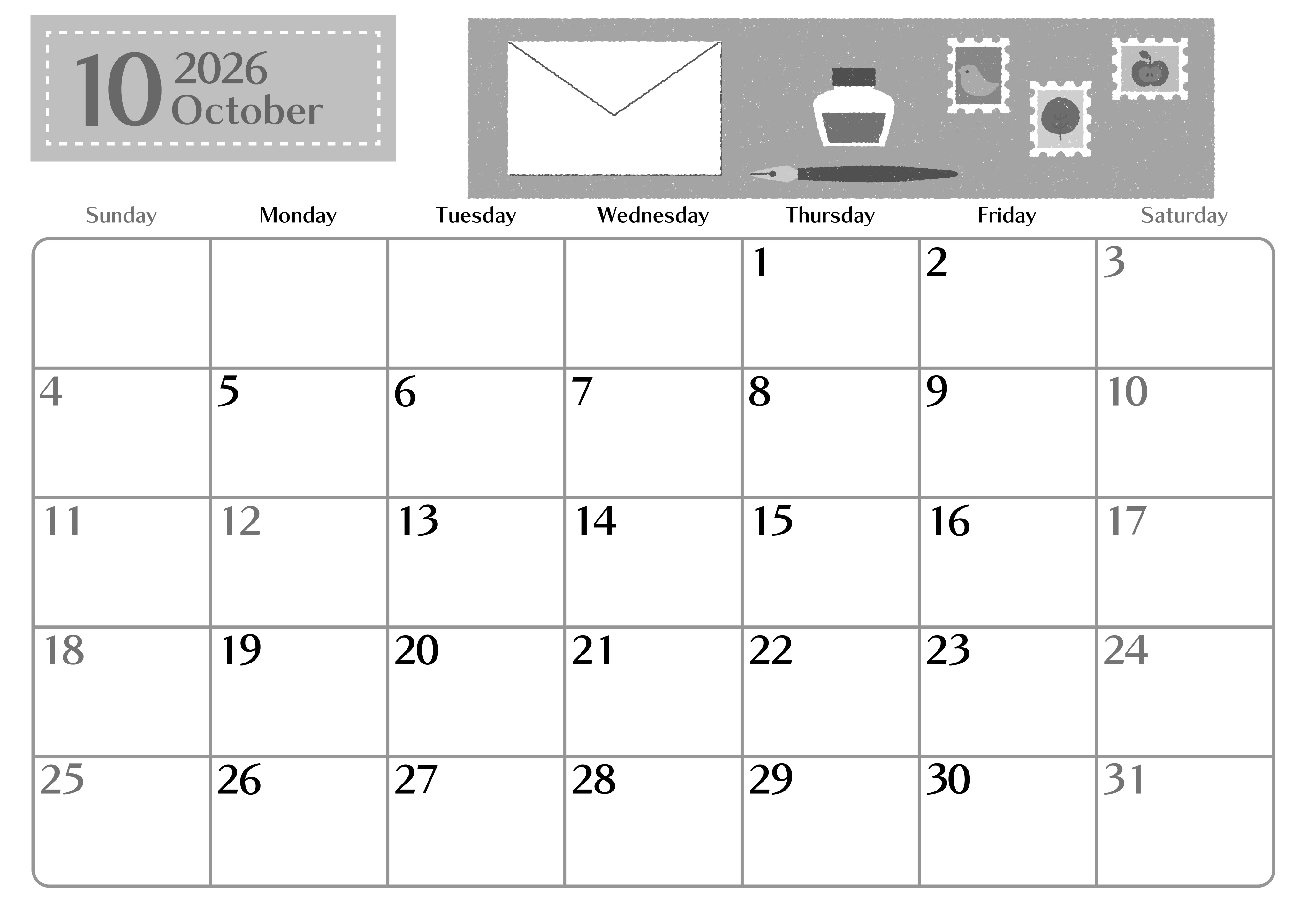2026年・無料のカレンダーテンプレート 2026年10月横型モノクロの日曜始まり 手紙イラストのおしゃれA4無料白黒カレンダー(2026-00471000) 素材状デザイン王 2025年4月1日 2026年10月横型モノクロの日曜始まりの無料テンプレート白黒カレンダーです。手紙や万年筆や切手のイラストがステーショナリー好きの心に刺さるおしゃれな世界観の白黒カレンダーを用意しました。(2026-00471000) 10月 横型のカレンダー 日曜始まり 白黒 カレンダーデザイン-0047