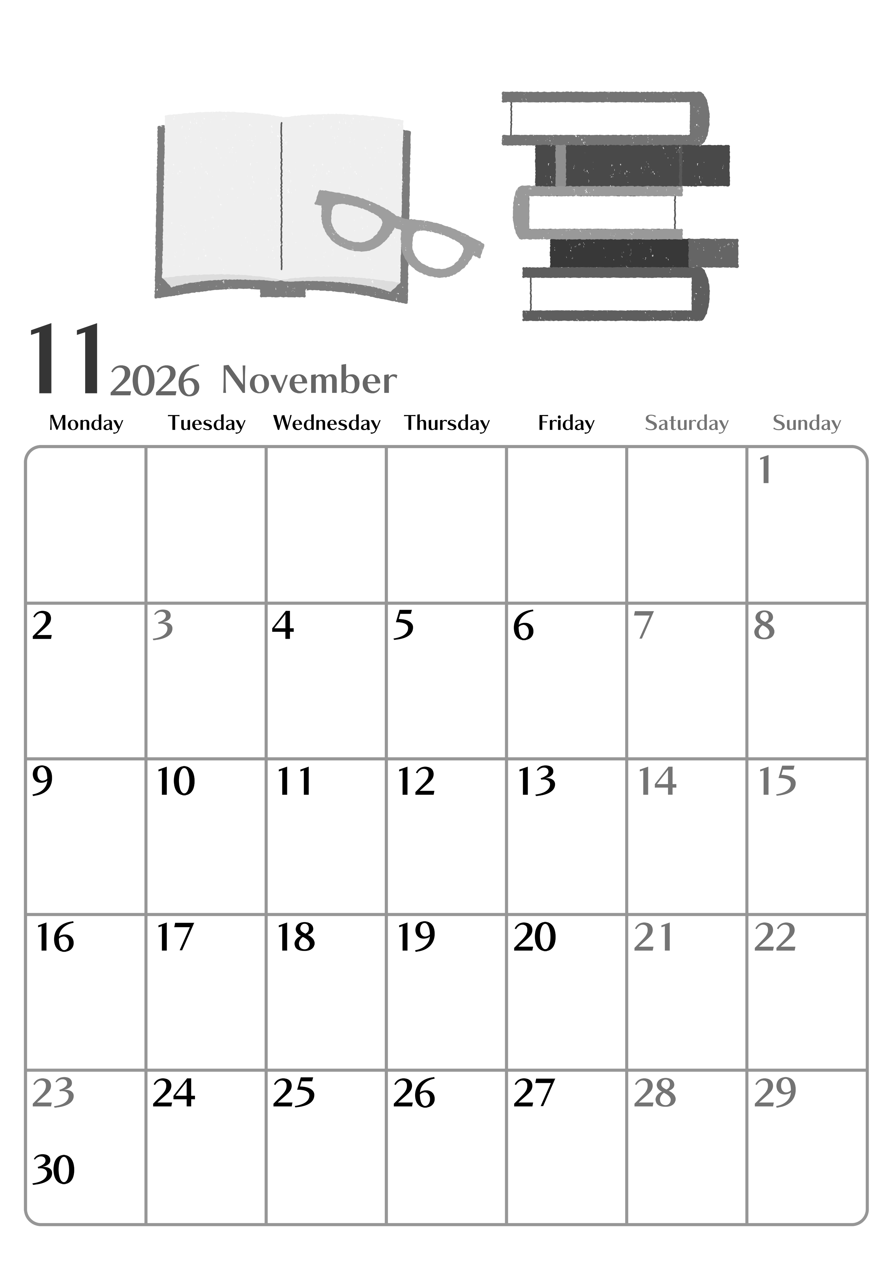 2026年11月縦型モノクロの月曜始まりの無料テンプレート白黒カレンダーです。本の読書モチーフのイラストがおしゃれで予定を書き込みやすい罫線がくっきりとしている実用性の高い縦向きの白黒カレンダーです。(2026-00471111)