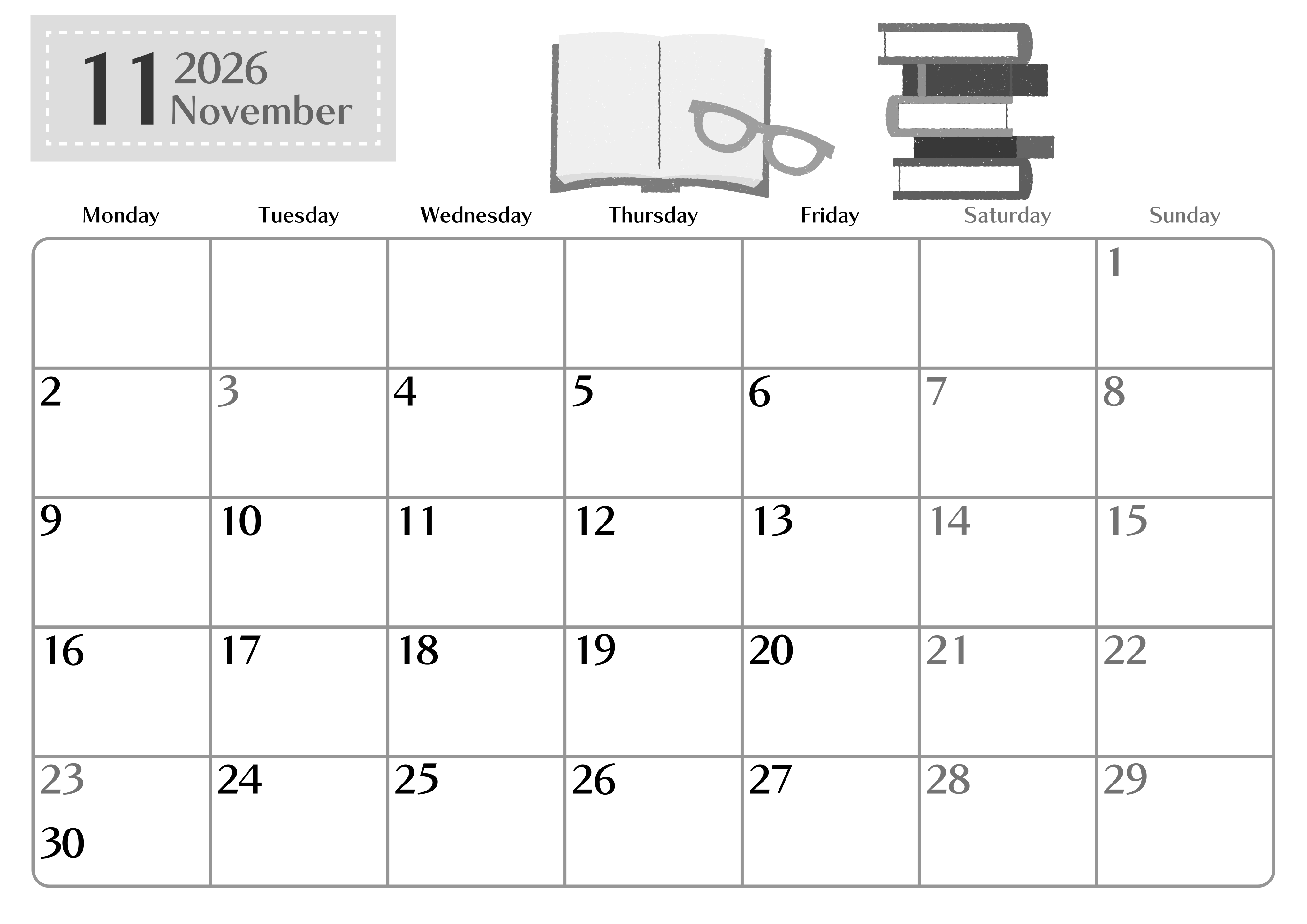 2026年11月横型モノクロの月曜始まりの無料テンプレート白黒カレンダーです。読書を題材にした沢山の分厚い本とメガネをイラスト化したおしゃれな雰囲気をまとった月曜始まりの使いやすい白黒カレンダーとなっています。(2026-00471101)