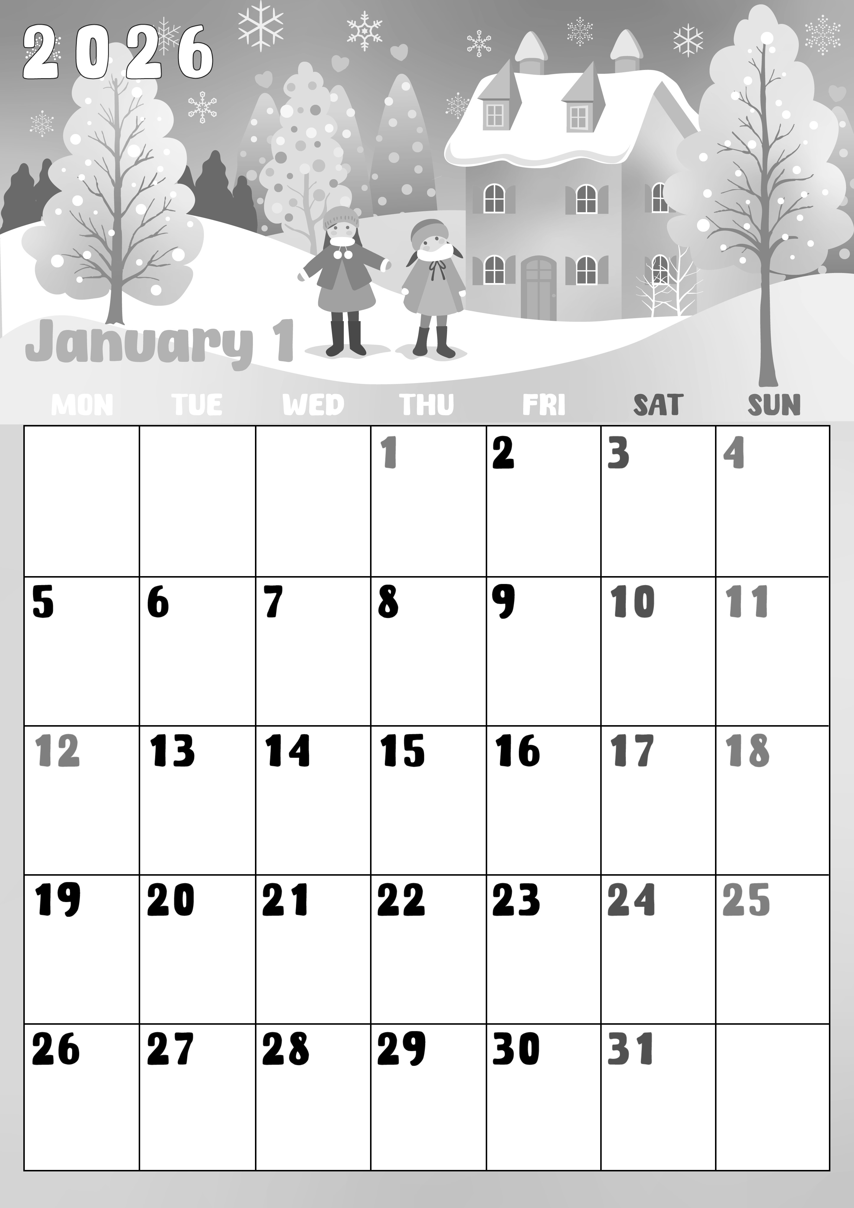 2026年・無料のカレンダーテンプレート 2026年1月縦型モノクロの月曜始まり イラストのかわいいA4無料白黒カレンダー(2026-00480111) 素材状デザイン王 2025年4月1日 2026年1月縦型モノクロの月曜始まりの無料テンプレート白黒カレンダーです。かわいいカレンダーで新年も心機一転しましょう。(2026-00480111) 1月 縦型のカレンダー 月曜始まり 白黒 カレンダーデザイン-0048