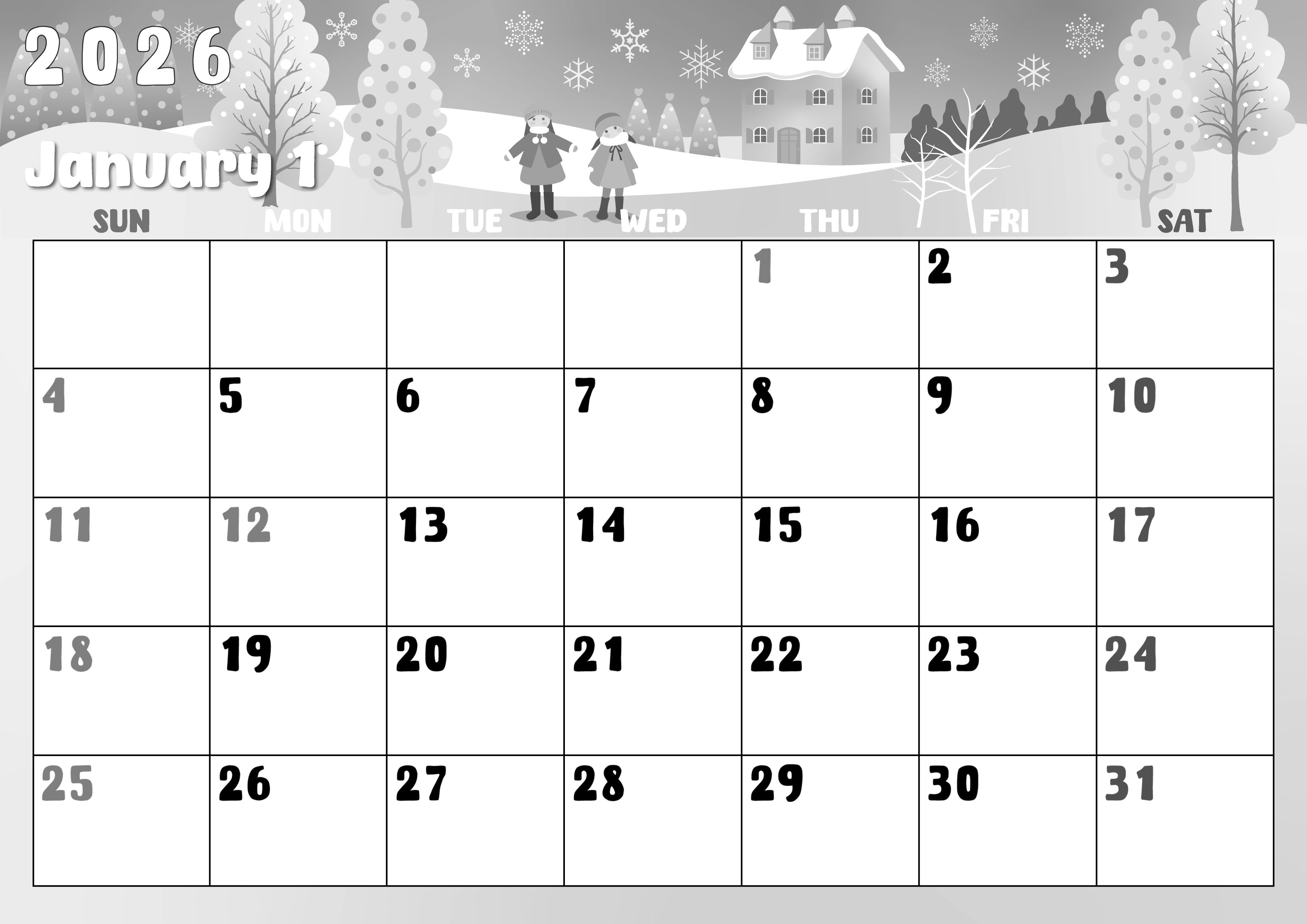 2026年1月横型モノクロの日曜始まりの無料テンプレート白黒カレンダーです。真っ白な雪景色の中を元気な子供たちが遊ぼうとワクワクしている様子のかわいい挿絵がほっこりとさせてくれます。新年の幕開けです。(2026-00480100)