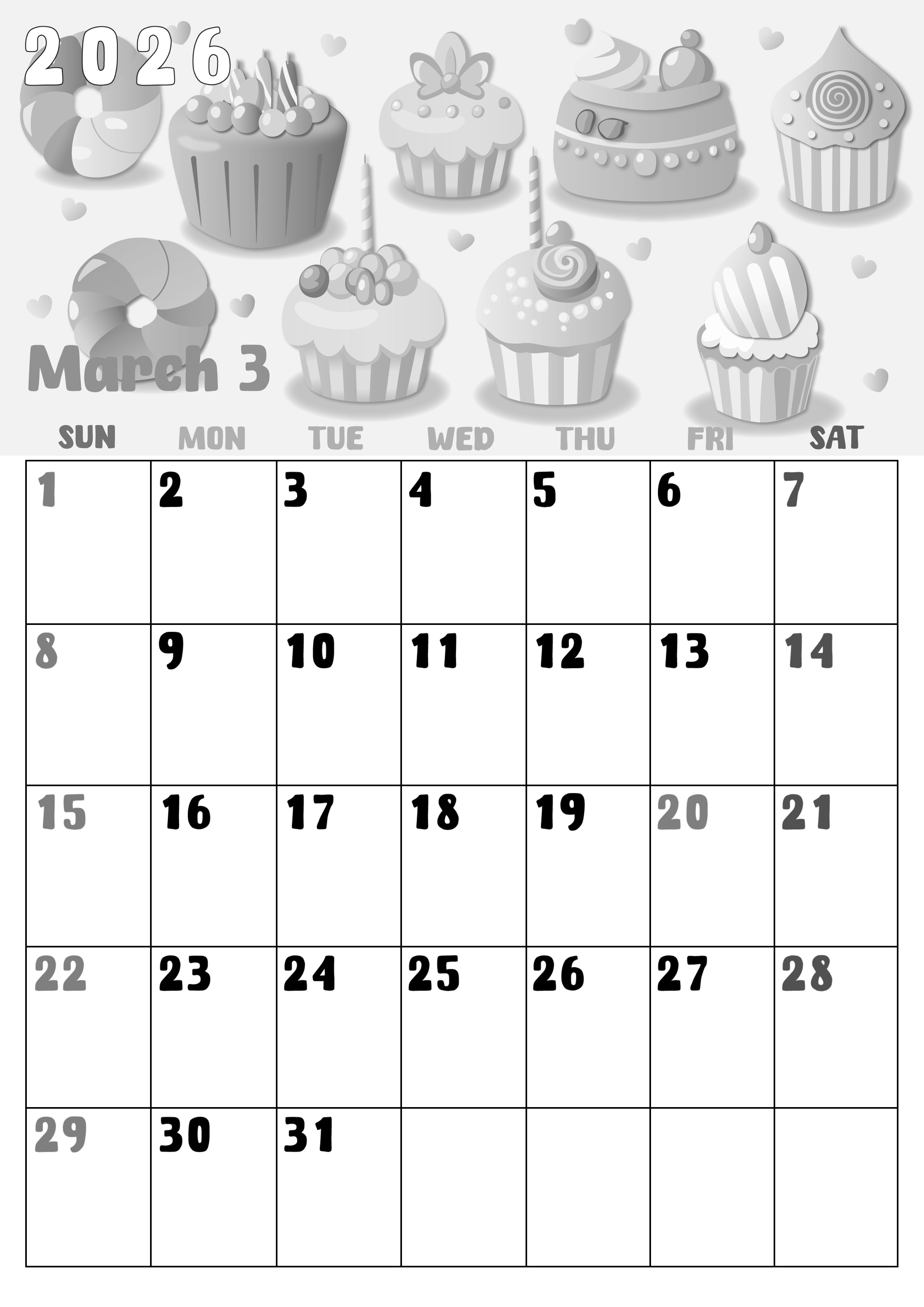 2026年・無料のカレンダーテンプレート 2026年3月縦型モノクロの日曜始まり イラストのかわいいA4無料白黒カレンダー(2026-00480310) 素材状デザイン王 2025年4月1日 2026年3月縦型モノクロの日曜始まりの無料テンプレート白黒カレンダーです。沢山使ってかわいいスイーツが盛り沢山に描かれているホワイトデーをほうふつとさせるデザインのイラストが目を引きます。(2026-00480310) 3月 縦型のカレンダー 日曜始まり 白黒 カレンダーデザイン-0048