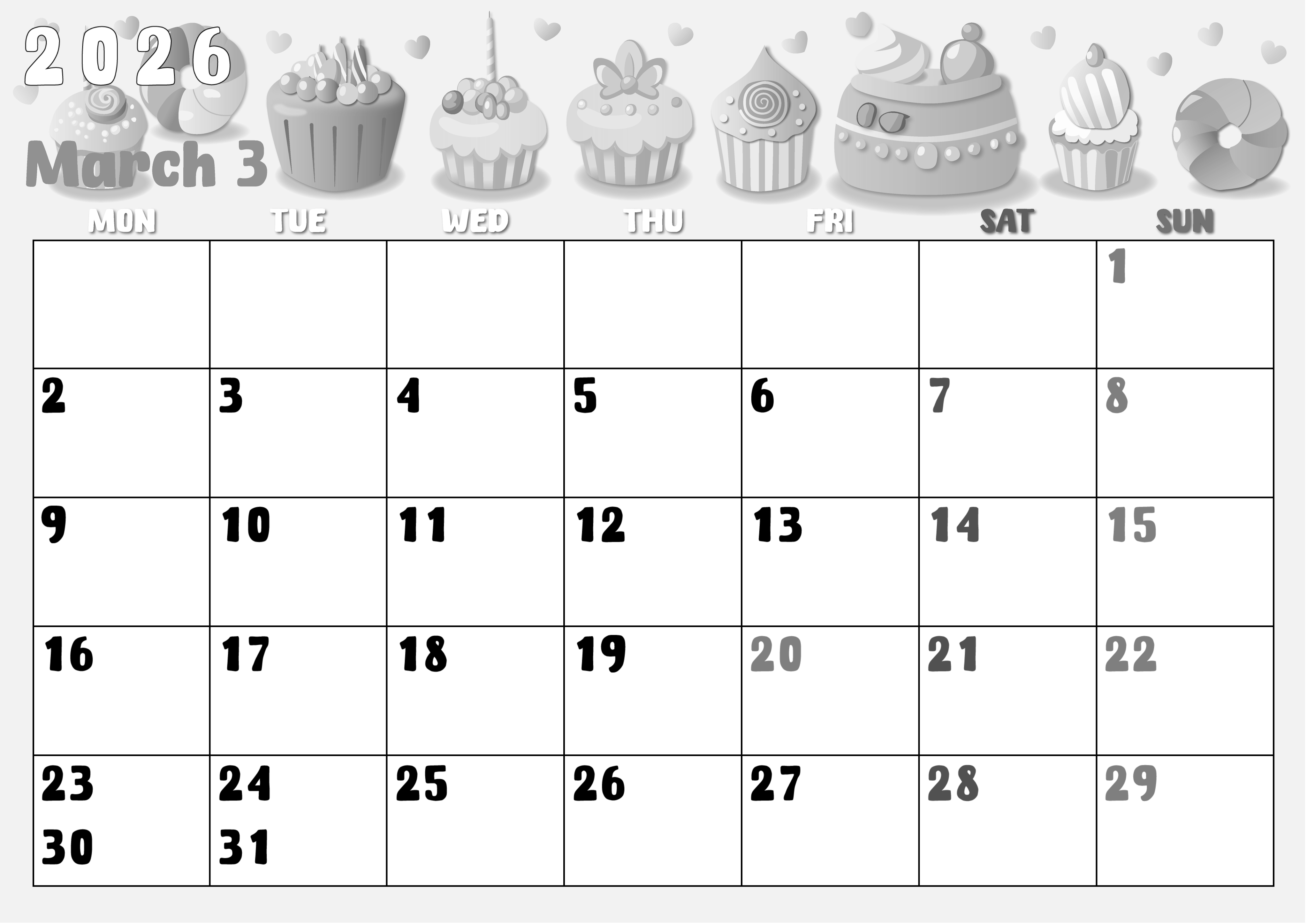 2026年・無料のカレンダーテンプレート 2026年3月横型モノクロの月曜始まり イラストのかわいいA4無料白黒カレンダー(2026-00480301) 素材状デザイン王 2025年4月1日 2026年3月横型モノクロの月曜始まりの無料テンプレート白黒カレンダーです。沢山のカップケーキが描かれているかわいい雰囲気が満載のアメリカナイズドなポップで元気なイラスト白黒カレンダーです。(2026-00480301) 3月 横型のカレンダー 月曜始まり 白黒 カレンダーデザイン-0048