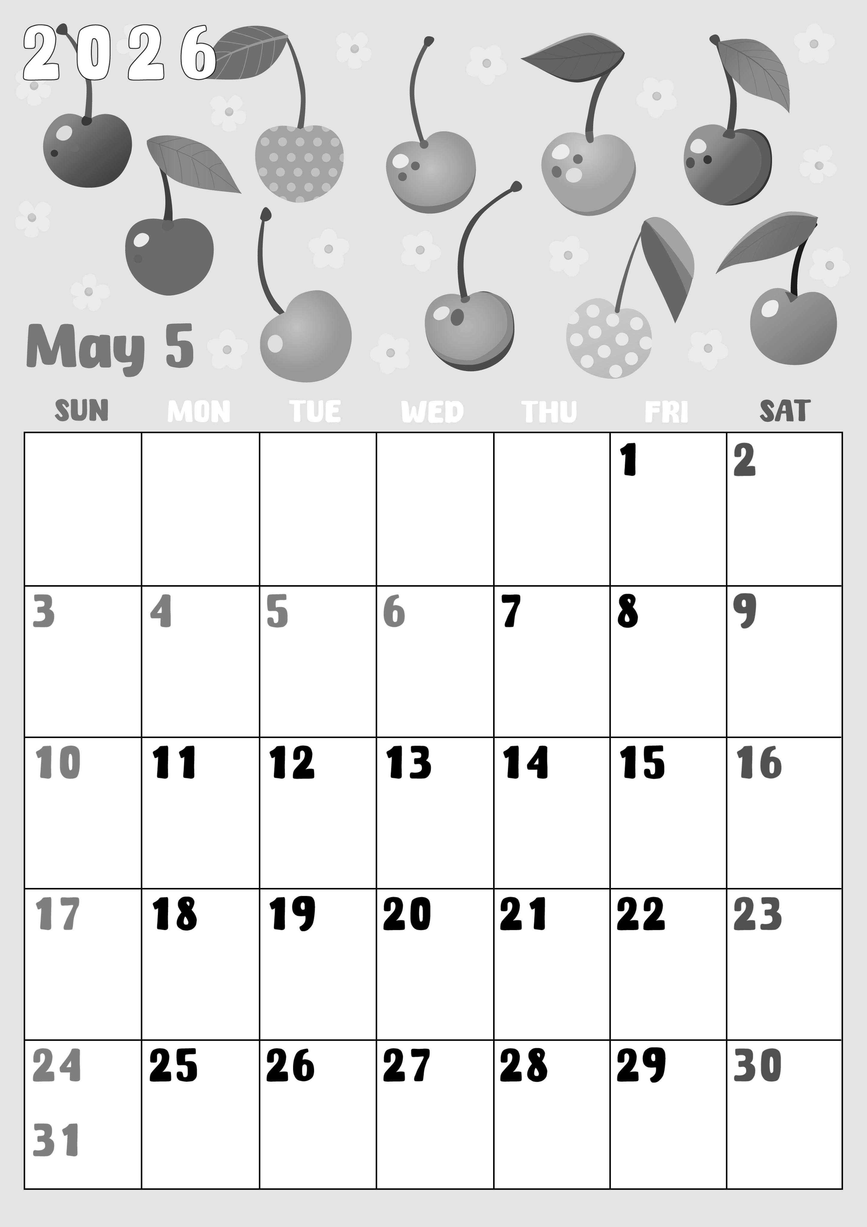 2026年・無料のカレンダーテンプレート 2026年5月縦型モノクロの日曜始まり サクランボイラストのかわいいA4無料白黒カレンダー(2026-00480510) 素材状デザイン王 2025年4月1日 2026年5月縦型モノクロの日曜始まりの無料テンプレート白黒カレンダーです。かわいいデザインのサクランボイラストなので女性に特におすすめしたい遊び心に溢れたフリー素材の縦向き白黒カレンダーです。(2026-00480510) 5月 縦型のカレンダー 日曜始まり 白黒 カレンダーデザイン-0048