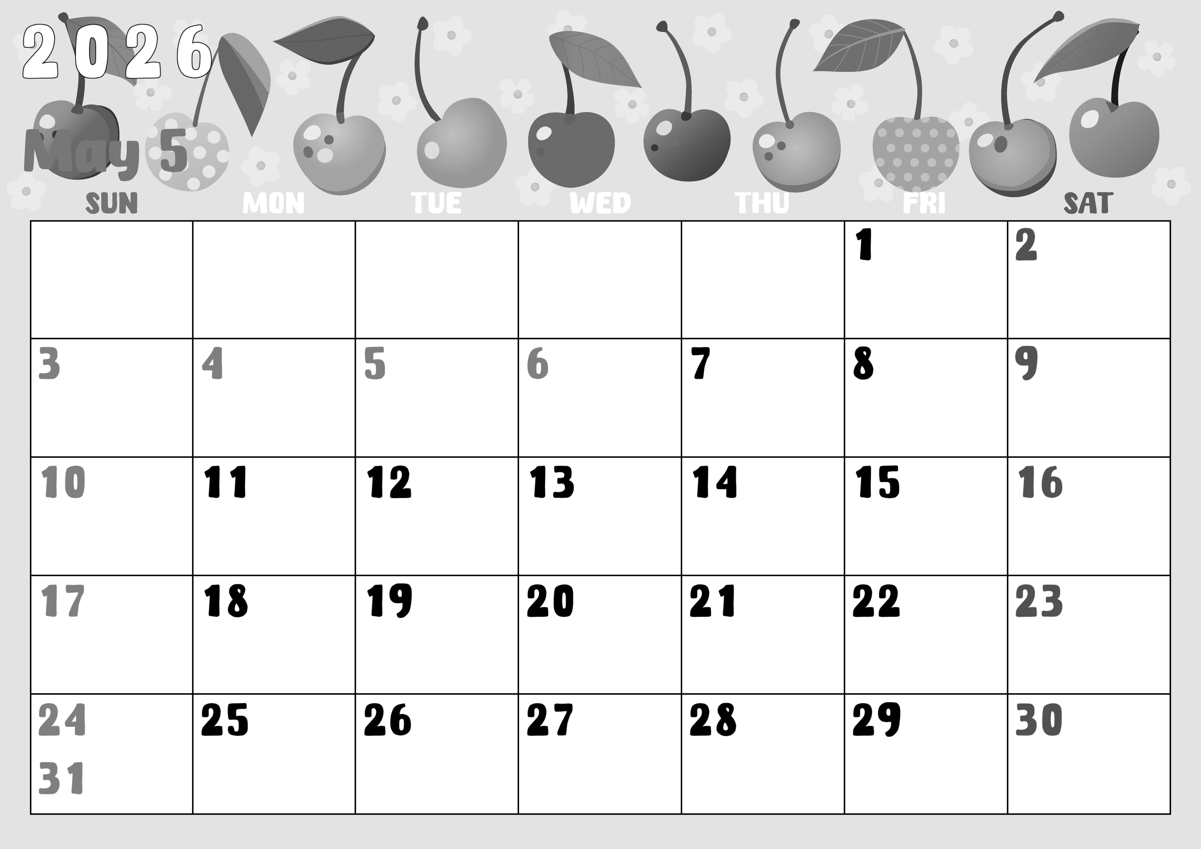 2026年・無料のカレンダーテンプレート 2026年5月横型モノクロの日曜始まり サクランボイラストのかわいいA4無料白黒カレンダー(2026-00480500) 素材状デザイン王 2025年4月1日 2026年5月横型モノクロの日曜始まりの無料テンプレート白黒カレンダーです。背景に様々なプルッとしたみずみずしいサクランボのイラストが女の子らしくてかわいいフリー素材です。(2026-00480500) 5月 横型のカレンダー 日曜始まり 白黒 カレンダーデザイン-0048