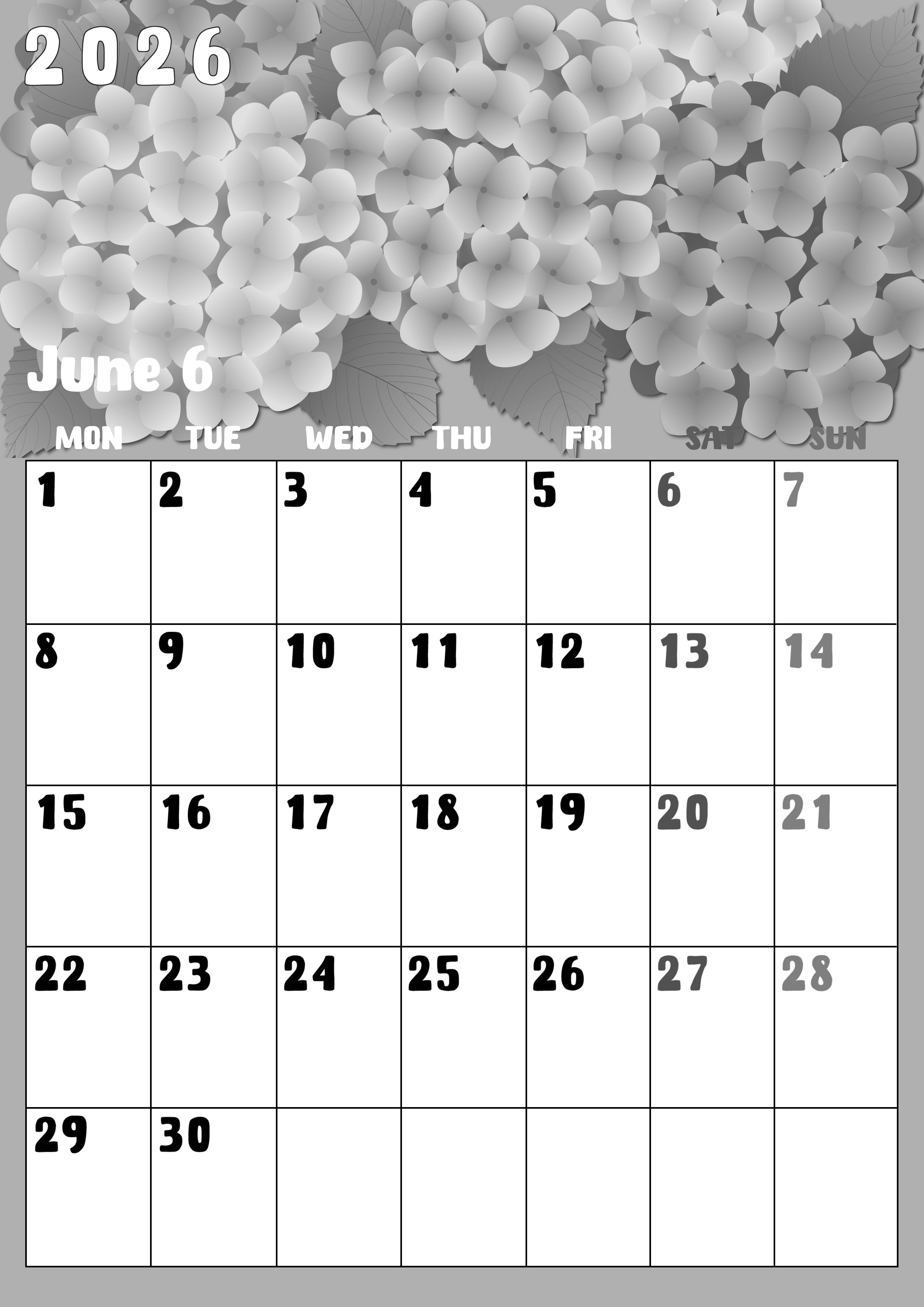 2026年・無料のカレンダーテンプレート 2026年6月縦型モノクロの月曜始まり アジサイイラストのかわいいA4無料白黒カレンダー(2026-00480611) 素材状デザイン王 2025年4月1日 2026年6月縦型モノクロの月曜始まりの無料テンプレート白黒カレンダーです。みずみずしく大きなアジサイがしきつめられている生命力を感じさせてくれるかわいいイラスト素材です。(2026-00480611) 6月 縦型のカレンダー 月曜始まり 白黒 カレンダーデザイン-0048