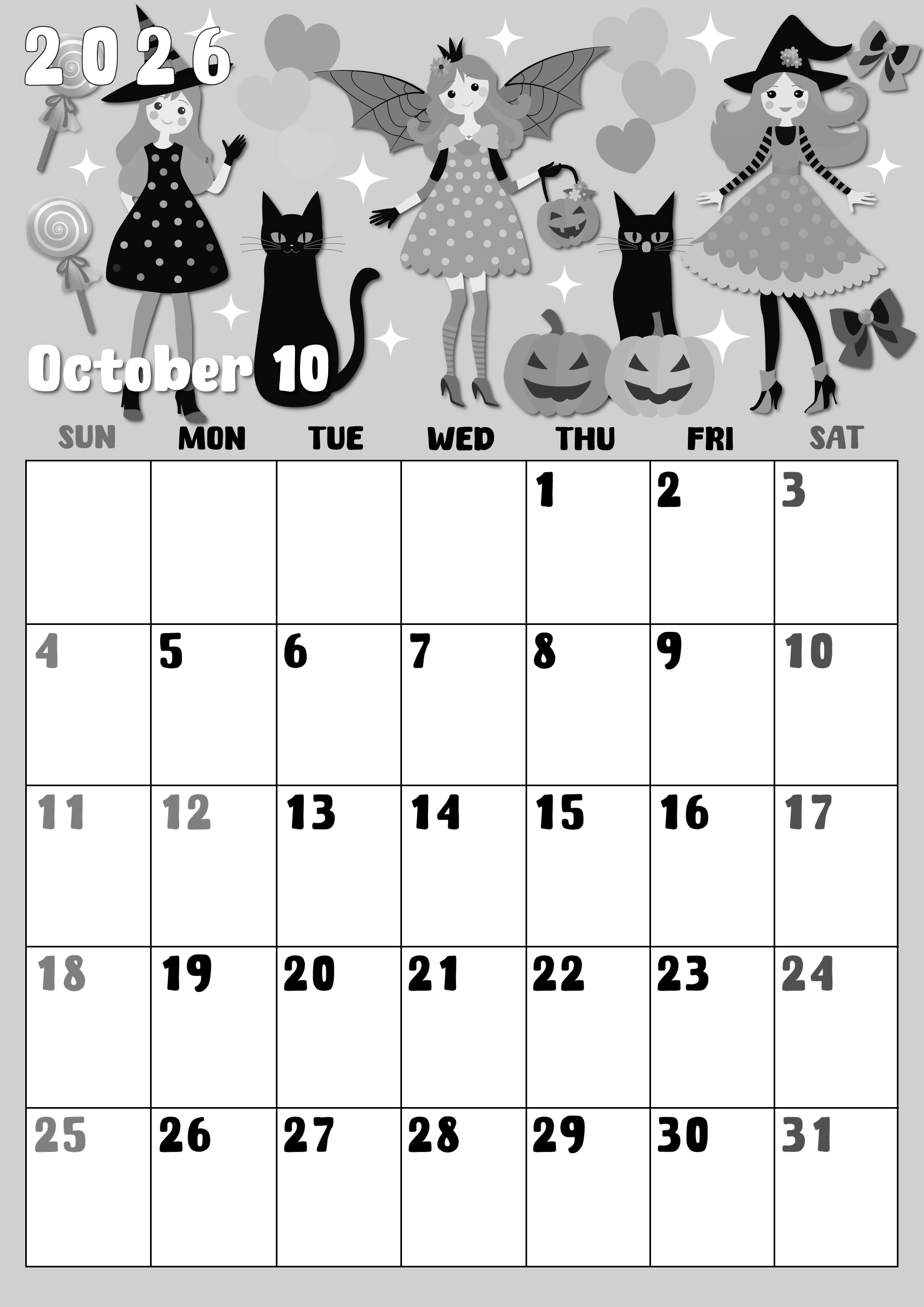2026年・無料のカレンダーテンプレート 2026年10月縦型モノクロの日曜始まり ポップなイラストのかわいいA4無料白黒カレンダー(2026-00481010) 素材状デザイン王 2025年4月1日 2026年10月縦型モノクロの日曜始まりの無料テンプレート白黒カレンダーです。ハロウィンパーティーをテーマにしているイベントの楽しさを表現したかわいいポップなイラストが目を引きます。(2026-00481010) 10月 縦型のカレンダー 日曜始まり 白黒 カレンダーデザイン-0048