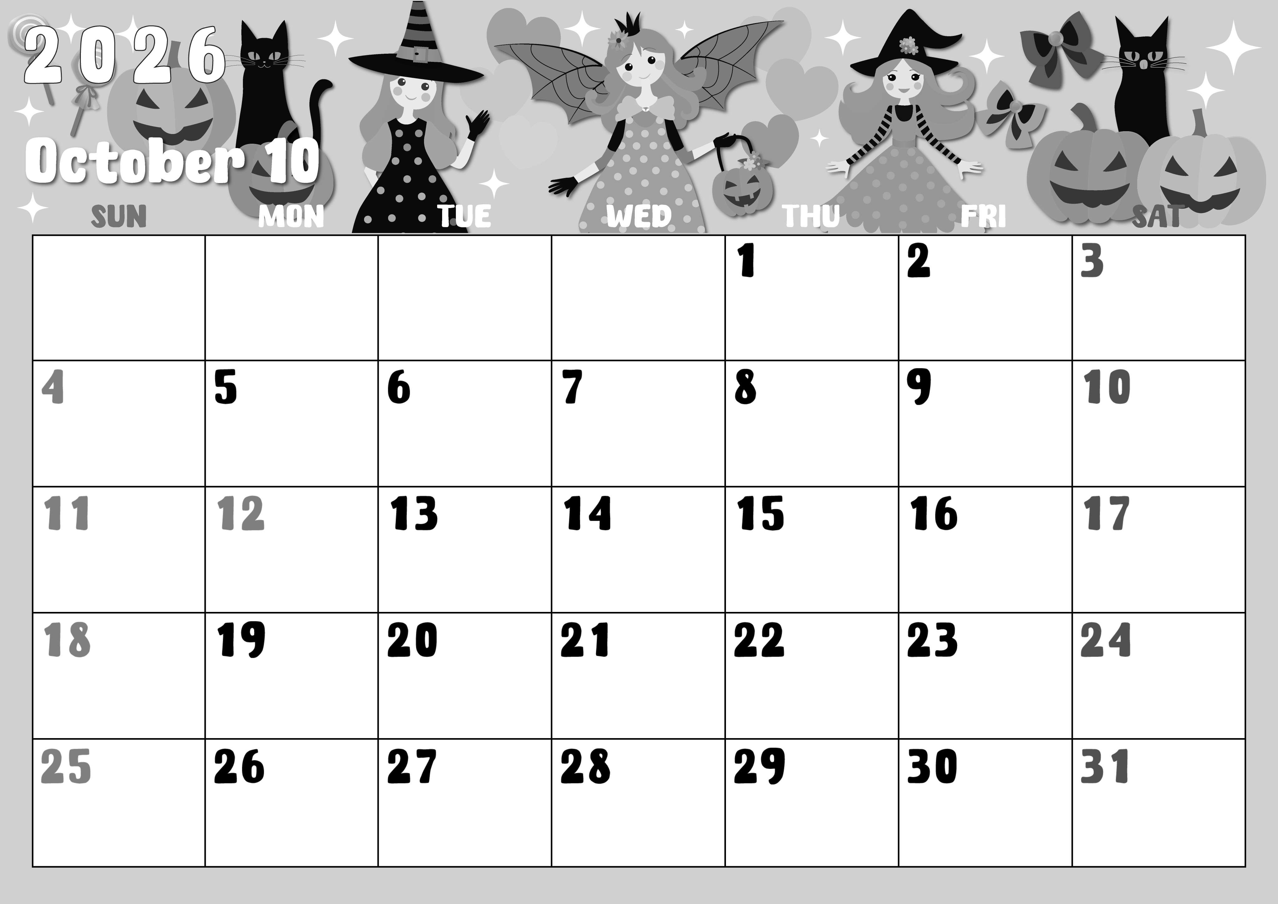 2026年・無料のカレンダーテンプレート 2026年10月横型モノクロの日曜始まり ポップなイラストのかわいいA4無料白黒カレンダー(2026-00481000) 素材状デザイン王 2025年4月1日 2026年10月横型モノクロの日曜始まりの無料テンプレート白黒カレンダーです。おしゃれで ポップな女の子たちがハロウィンで個性的な仮装をしている様子がとてもかわいいイラストとなっています。(2026-00481000) 10月 横型のカレンダー 日曜始まり 白黒 カレンダーデザイン-0048