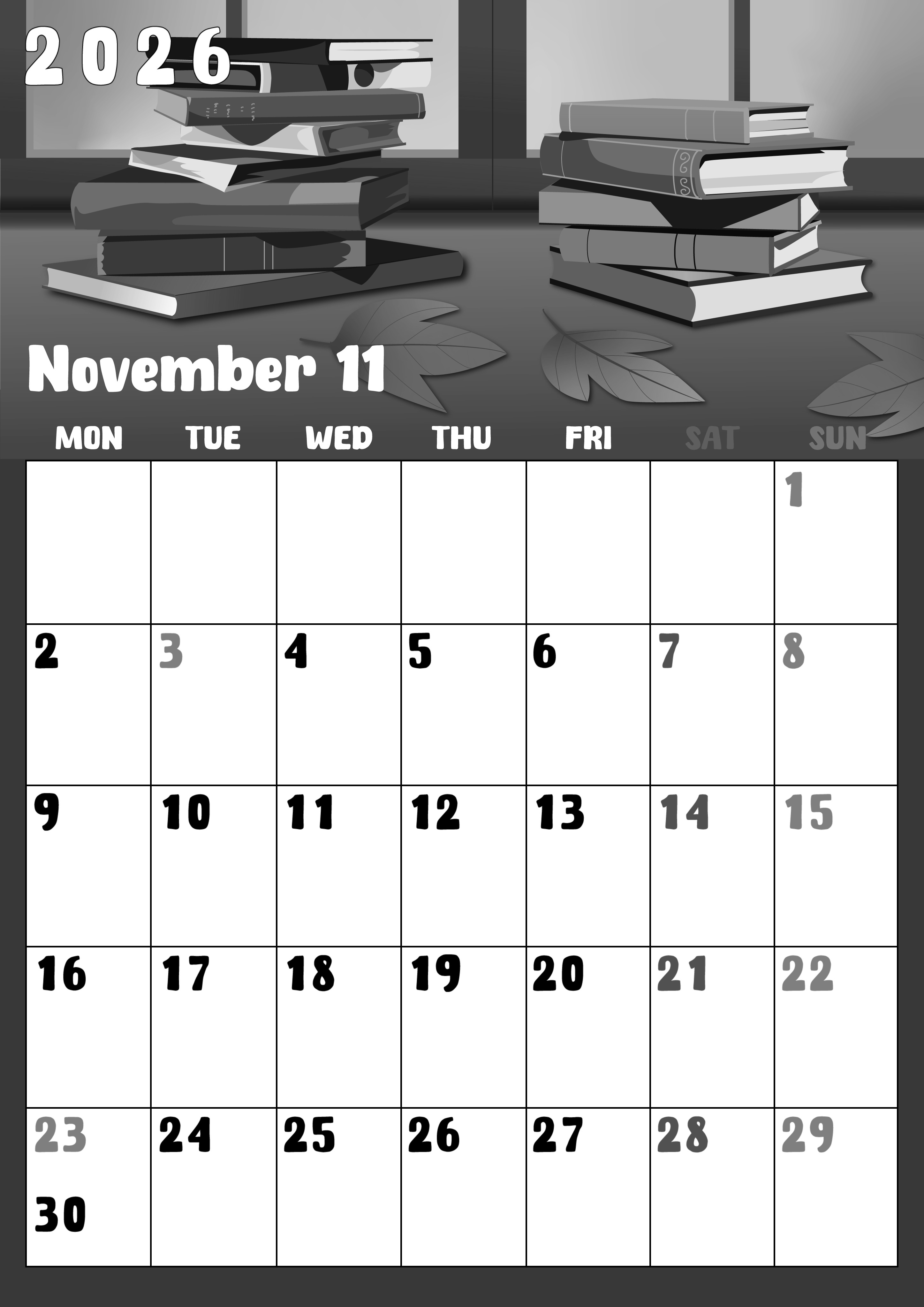 2026年11月縦型モノクロの月曜始まりの無料テンプレート白黒カレンダーです。文字がぷっくりとしていてかわいい白黒カレンダーです。予定を記入するエリアは背景が白色なので書き込みがしやすい利便性の高いフリー素材となっています。本のイラストもポイントです。(2026-00481111)