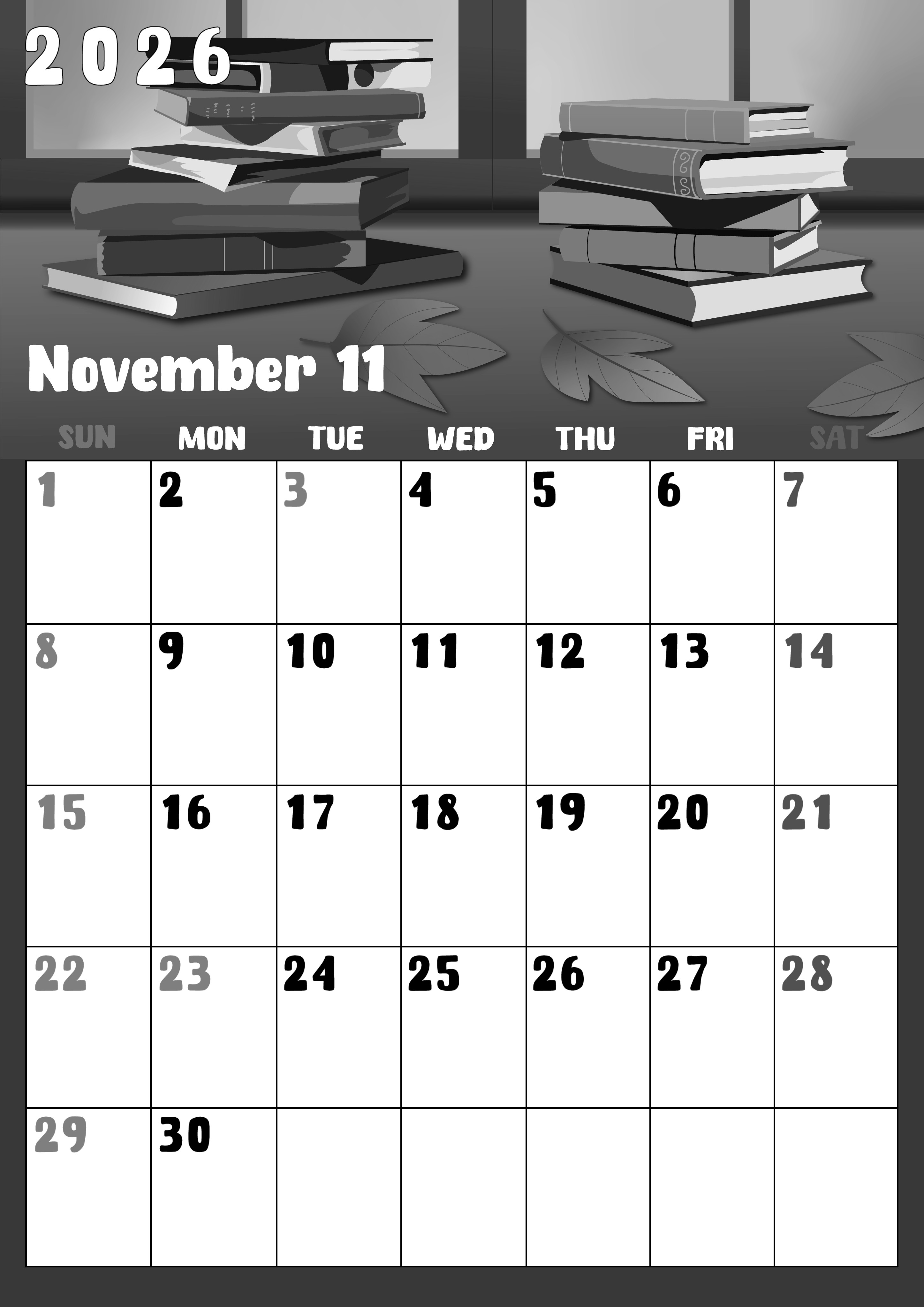 2026年11月縦型モノクロの日曜始まりの無料テンプレート白黒カレンダーです。かわいい雰囲気がしっかりとある本の白黒カレンダーとなっています。曜日によって色分け文字が使われているので見やすいです。(2026-00481110)