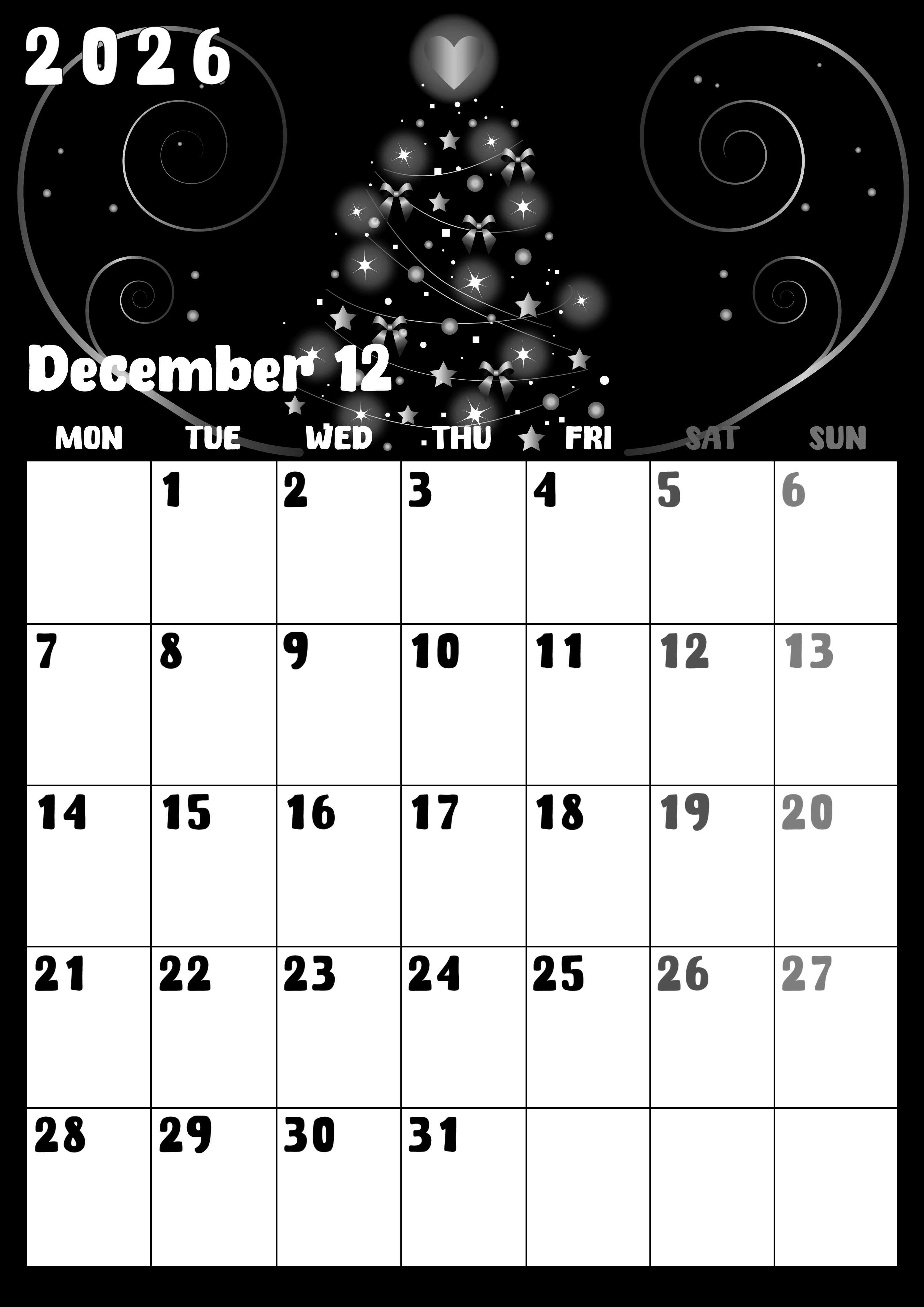 2026年12月縦型モノクロの月曜始まりの無料テンプレート白黒カレンダーです。クリスマスツリーの一番上にはハートがあしらわれていてかわいいイラストに心温まります。計画を立てるのに前向きになれる白黒カレンダーです。(2026-00481211)