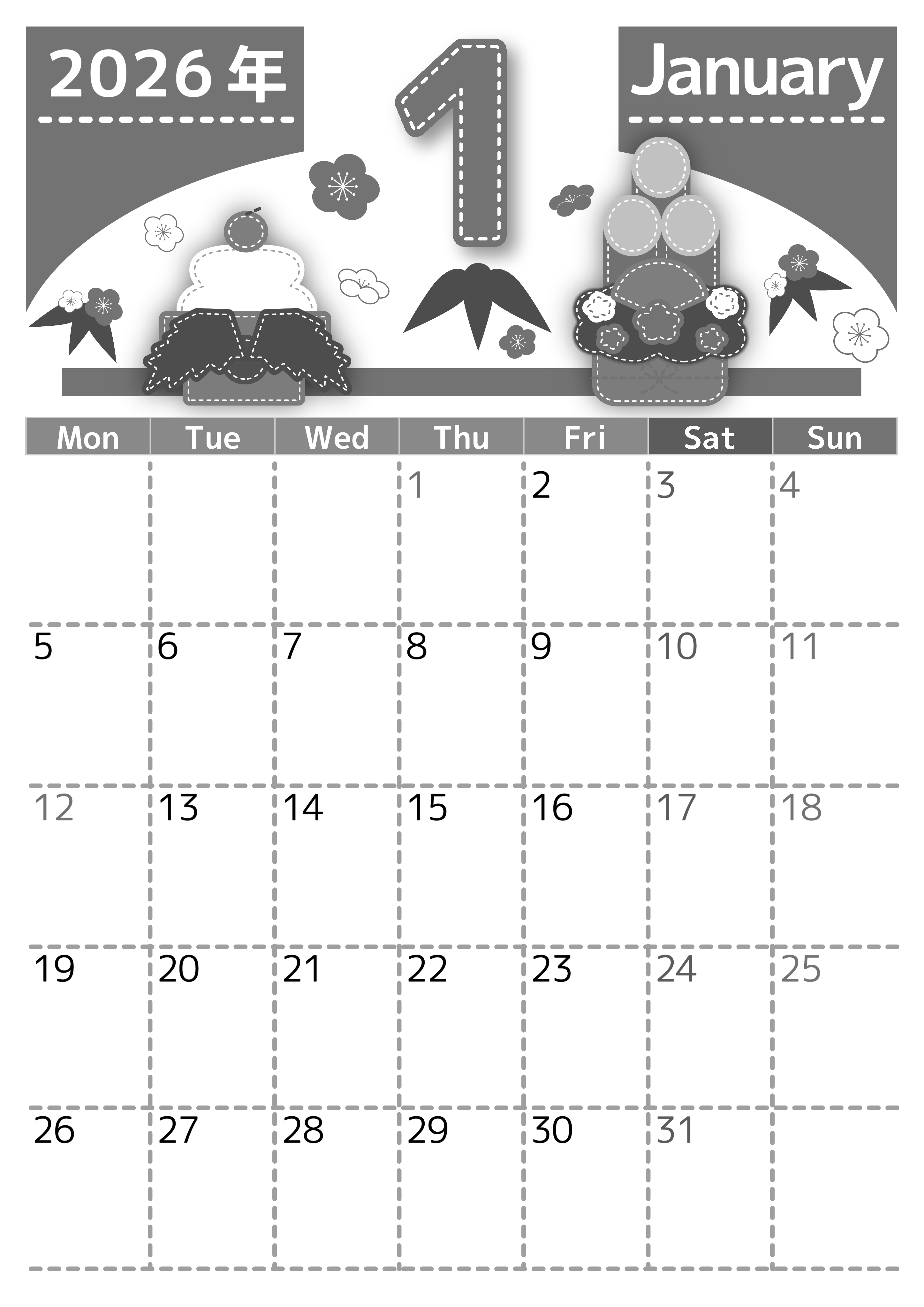 2026年・無料のカレンダーテンプレート 2026年1月縦型モノクロの月曜始まり イラストのかわいいA4無料白黒カレンダー(2026-00490111) 素材状デザイン王 2025年4月1日 2026年1月縦型モノクロの月曜始まりの無料テンプレート白黒カレンダーです。心を新たに新年のスタートダッシュを切るのにふさわしい計画を立てやすいかわいいイラストカレンダーです。(2026-00490111) 1月 縦型のカレンダー 月曜始まり 白黒 カレンダーデザイン-0049