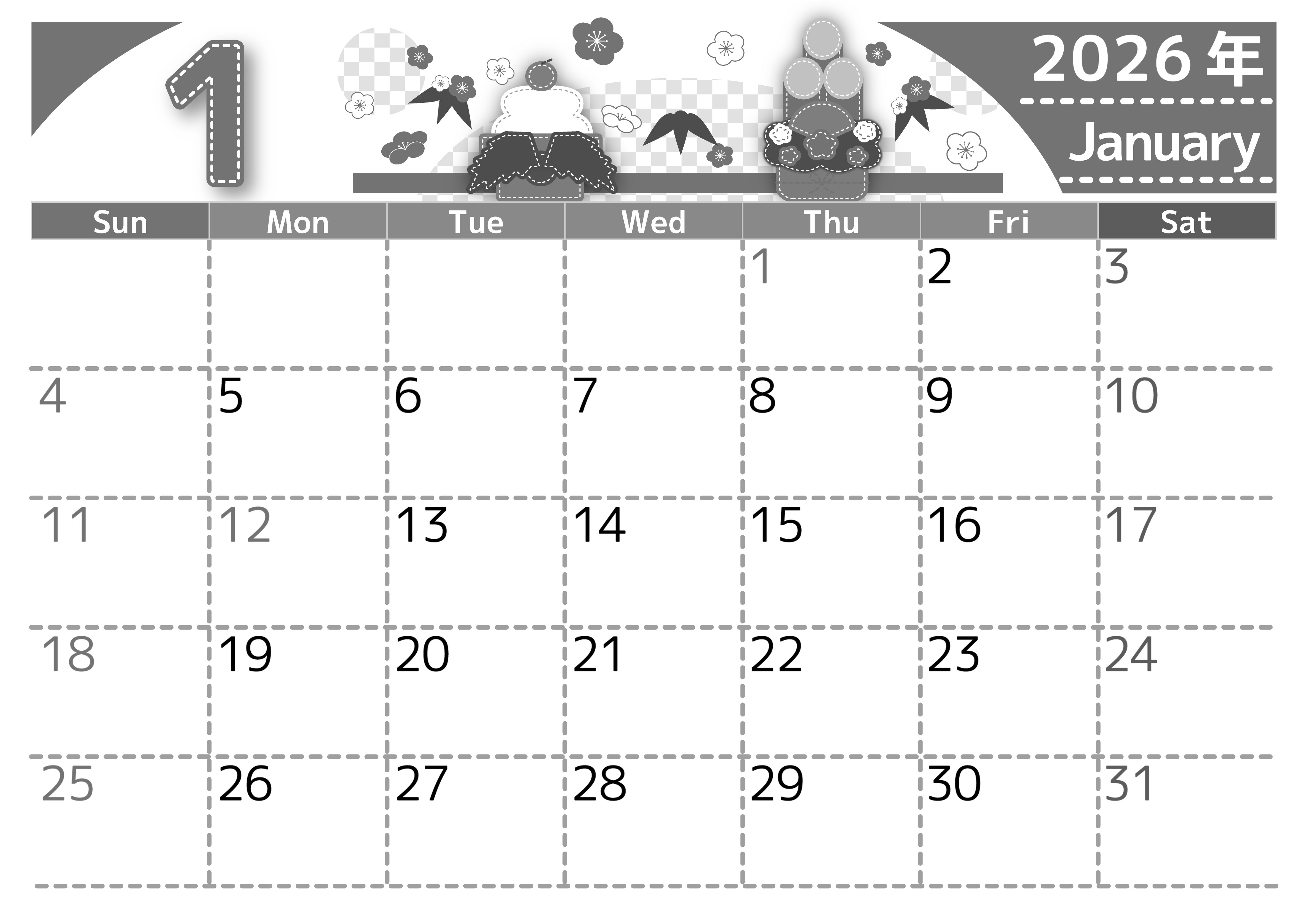 2026年1月横型モノクロの日曜始まりの無料テンプレート白黒カレンダーです。パッチワークのようなかわいい雰囲気でお正月ムードのイラストが元気よく描かれたポップさが特徴です。切り取り線風な線がかわいいです。(2026-00490100)