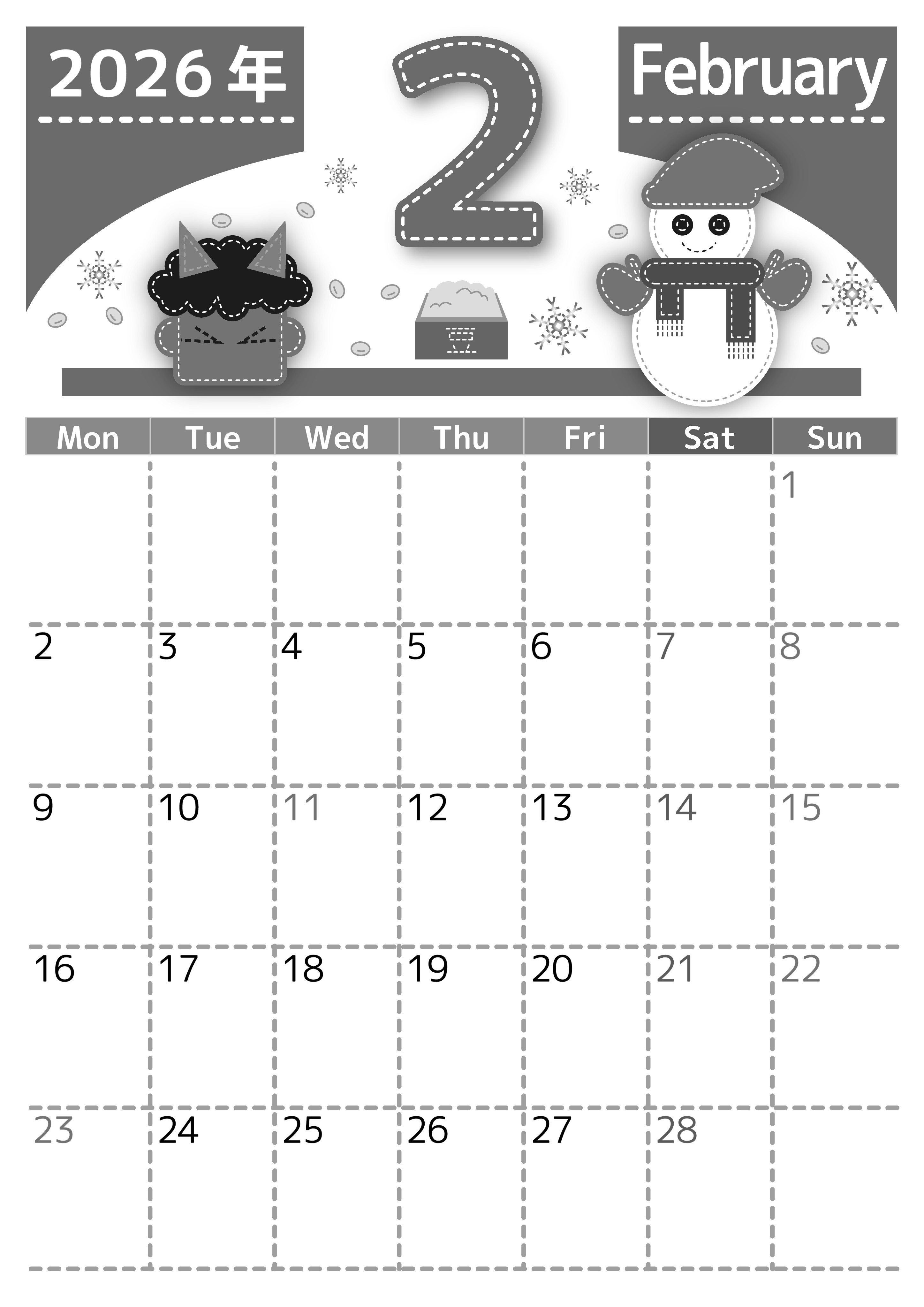 2026年・無料のカレンダーテンプレート 2026年2月縦型モノクロの月曜始まり イラストのかわいいA4無料白黒カレンダー(2026-00490211) 素材状デザイン王 2025年4月1日 2026年2月縦型モノクロの月曜始まりの無料テンプレート白黒カレンダーです。極寒の冬の心を温めてくれるようなかわいいデザイン素材です。(2026-00490211) 2月 縦型のカレンダー 月曜始まり 白黒 カレンダーデザイン-0049