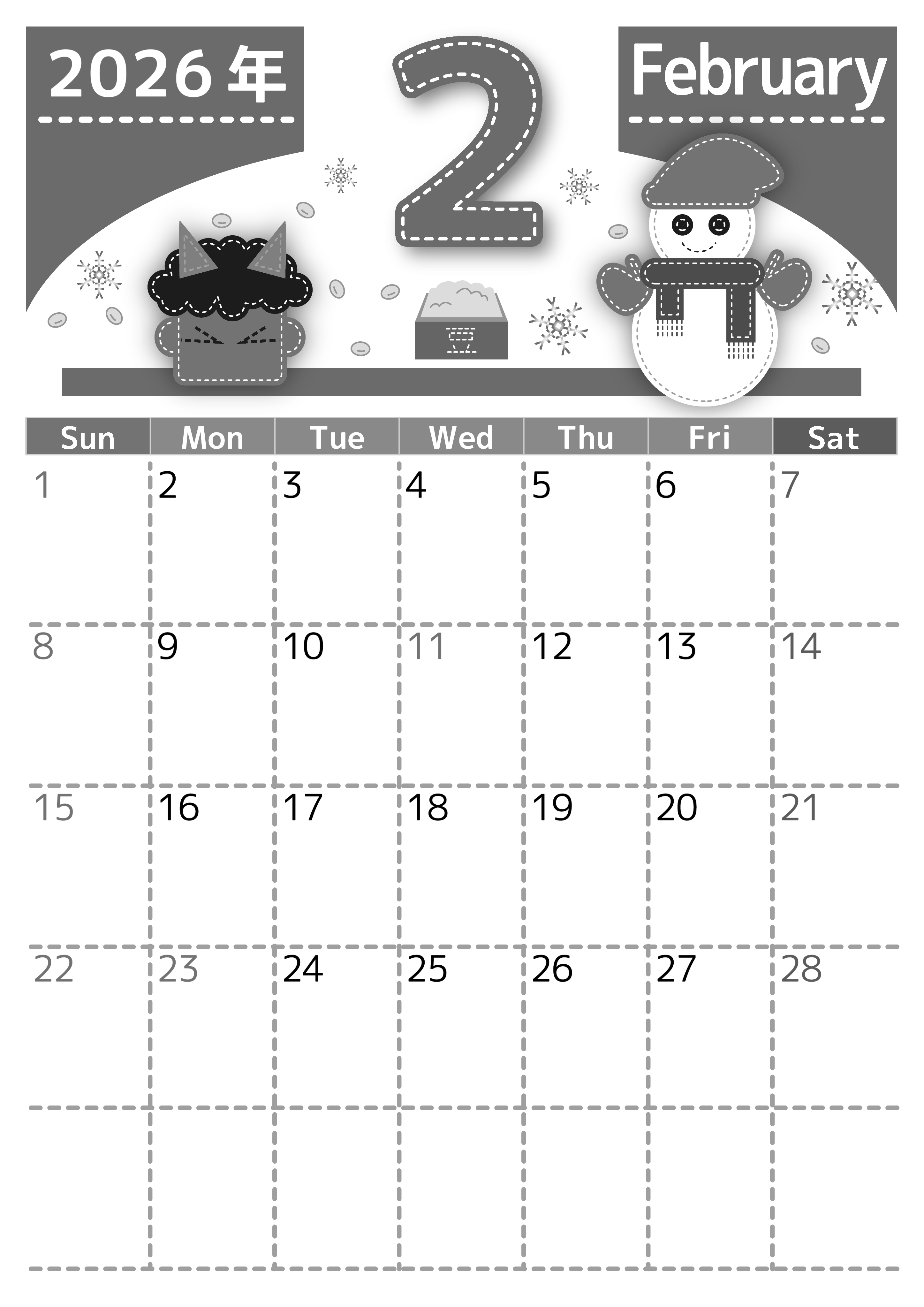 2026年・無料のカレンダーテンプレート 2026年2月縦型モノクロの日曜始まり イラストのかわいいA4無料白黒カレンダー(2026-00490210) 素材状デザイン王 2025年4月1日 2026年2月縦型モノクロの日曜始まりの無料テンプレート白黒カレンダーです。バレンタインの気分を盛り上げてくれるかわいいイラスト素材です。(2026-00490210) 2月 縦型のカレンダー 日曜始まり 白黒 カレンダーデザイン-0049