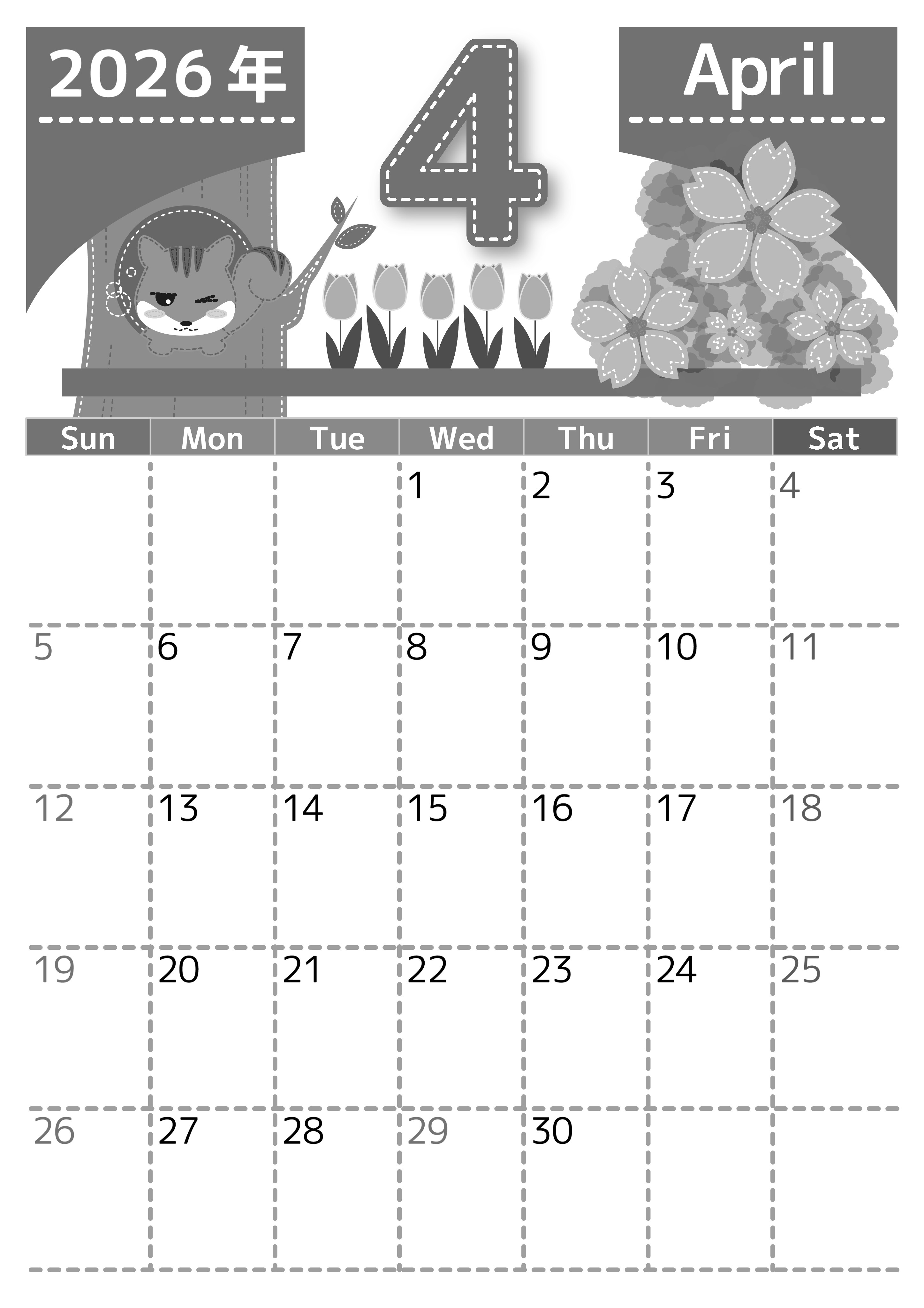 2026年4月縦型モノクロの日曜始まり リスのイラストがかわいいA4無料白黒カレンダー(2026-00490410)
