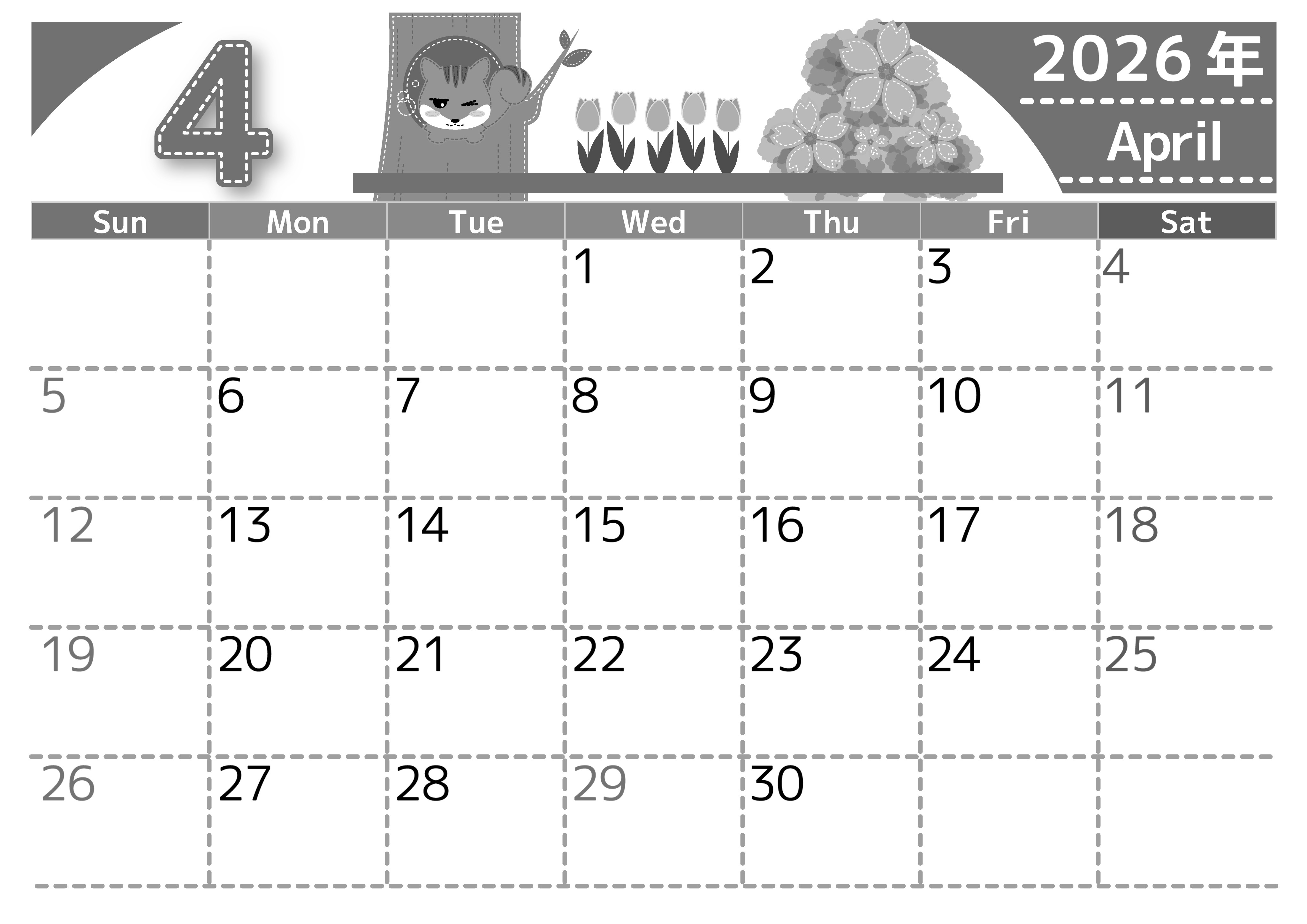 2026年4月横型モノクロの日曜始まりの無料テンプレート白黒カレンダーです。リスが大木のくぼみの中でリラックスをしている様子のイラストがかわいい春を感じさせる日曜始まり白黒カレンダー素材となっています。(2026-00490400)