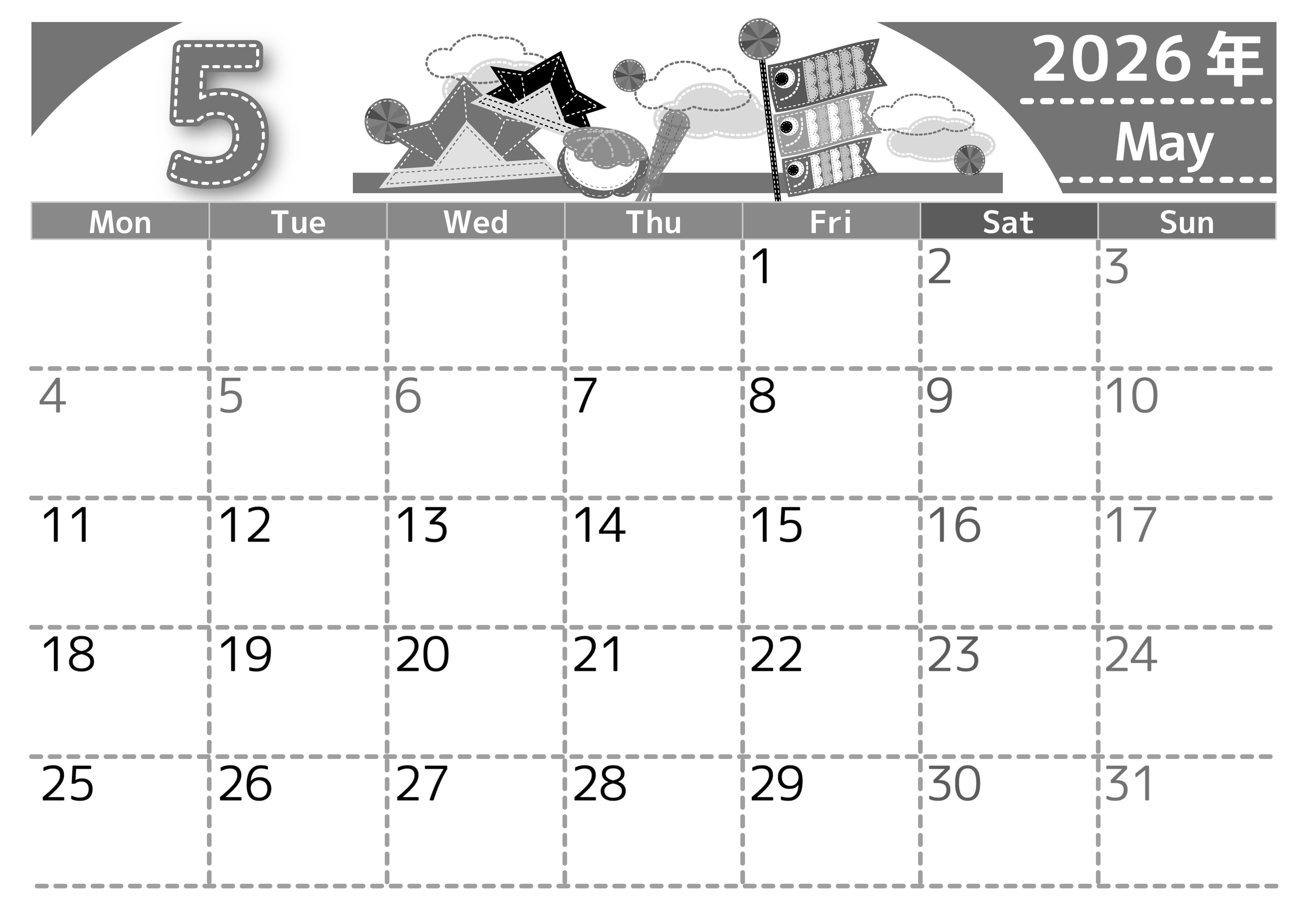 2026年5月横型モノクロの月曜始まりの無料テンプレート白黒カレンダーです。お目目がぱっちりとした鯉のぼりのイラストがかわいいほのぼのとした気持ちにさせてくれるデザインの月曜始まり白黒カレンダーとなっています。(2026-00490501)