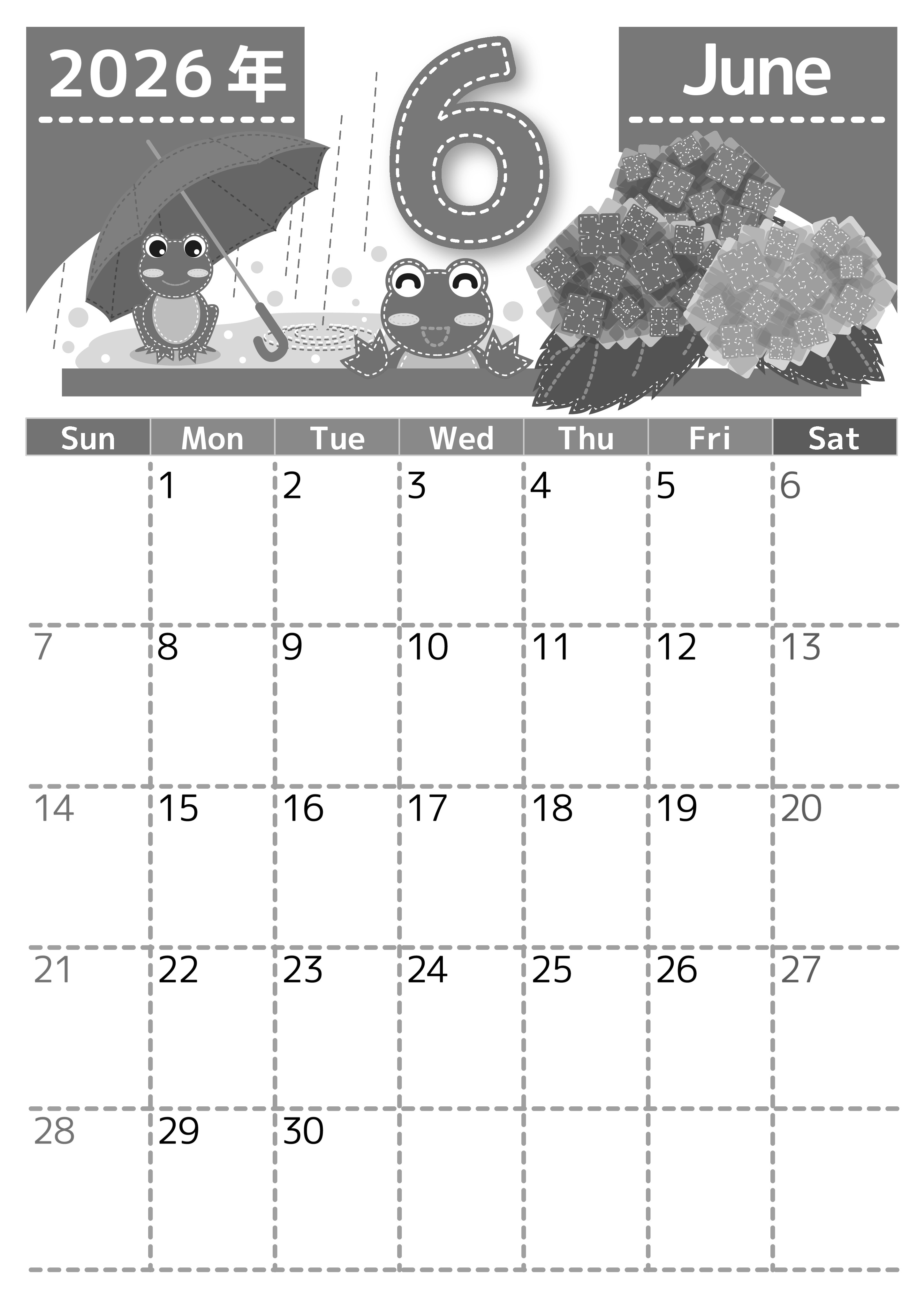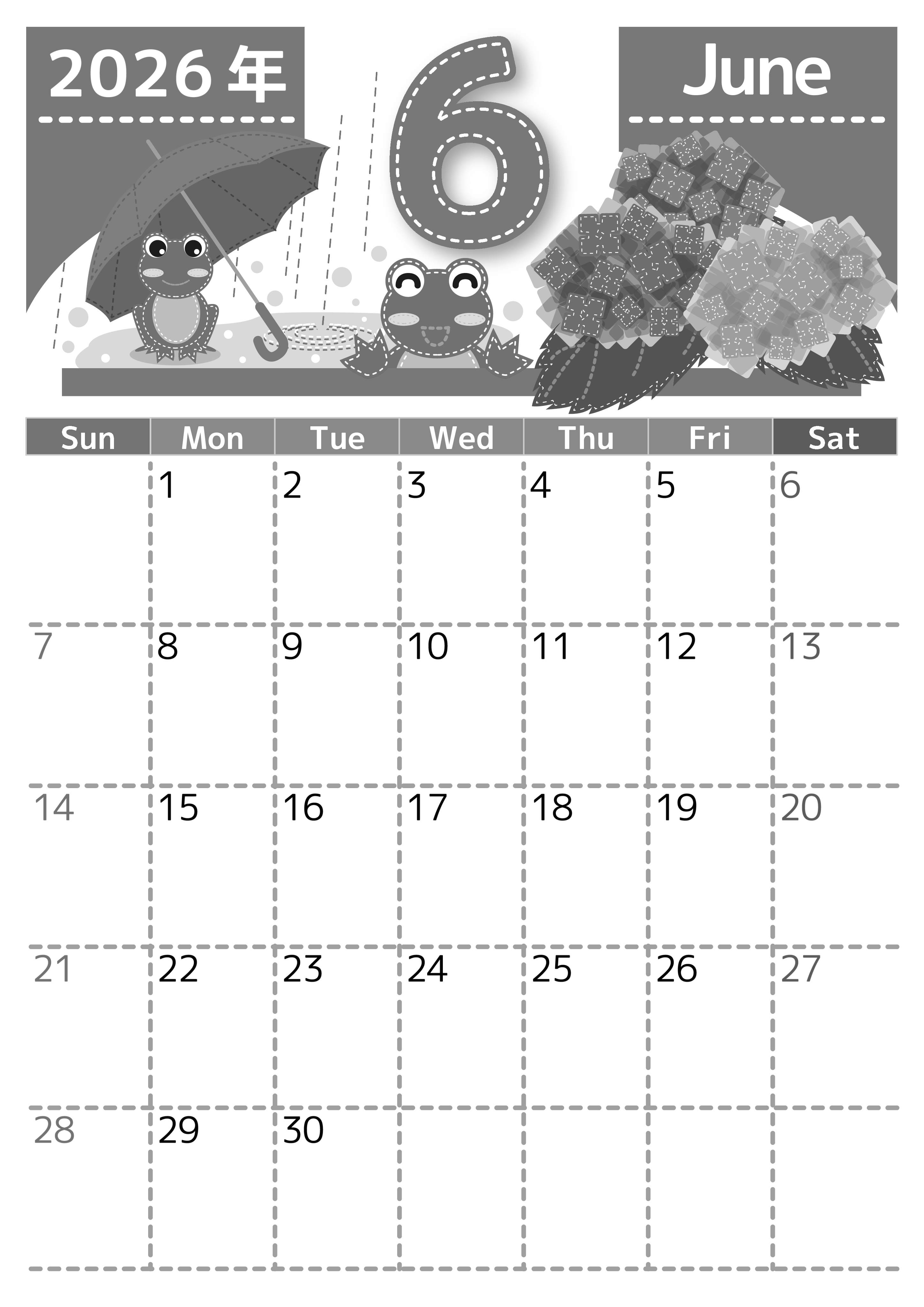 2026年6月縦型モノクロの日曜始まりの無料テンプレート白黒カレンダーです。梅雨空のどんよりした空気から鬱憤を吹き飛ばしてくれるような元気いっぱいのアマガエルがかわいいイラスト縦向き白黒カレンダーとなっています。(2026-00490610)