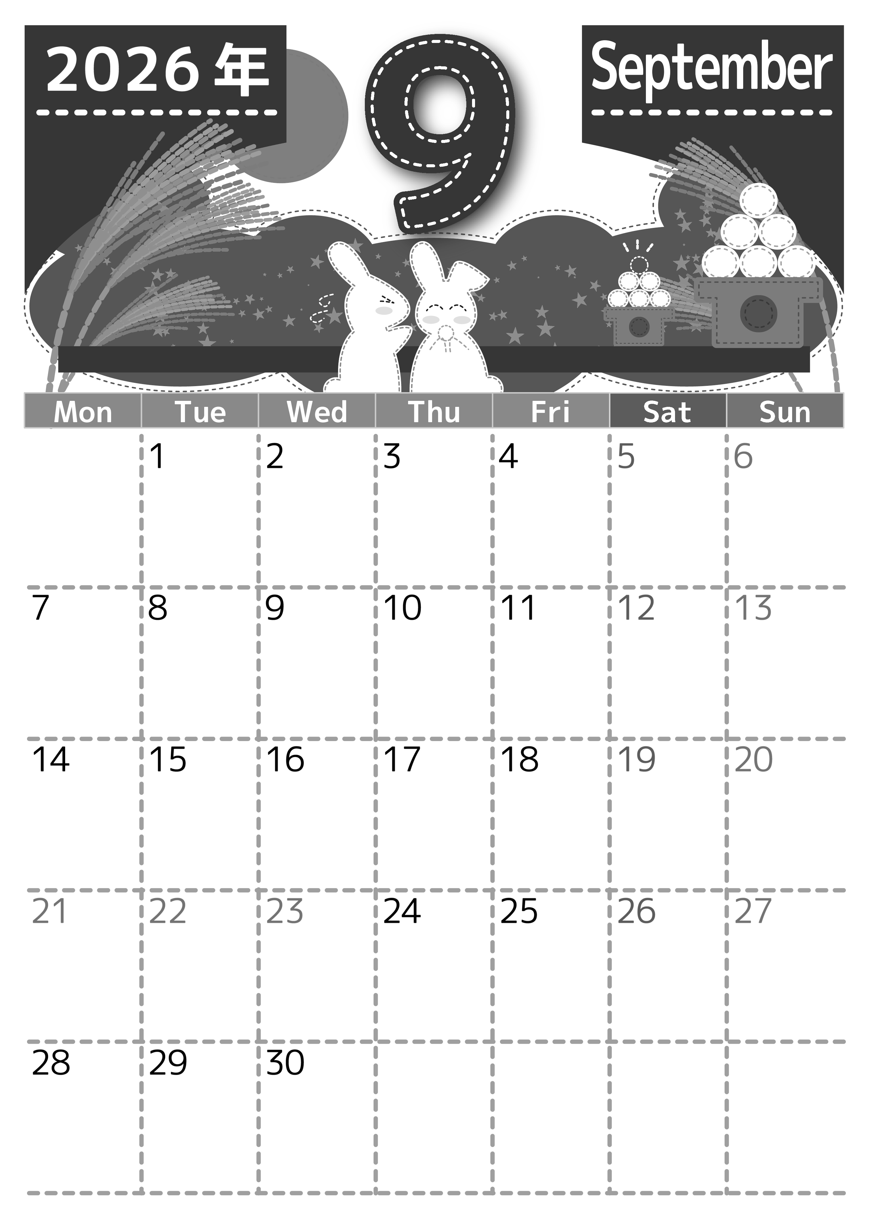 2026年・無料のカレンダーテンプレート 2026年9月縦型モノクロの月曜始まり 白うさぎイラストのかわいいA4無料白黒カレンダー(2026-00490911) 素材状デザイン王 2025年4月1日 2026年9月縦型モノクロの月曜始まりの無料テンプレート白黒カレンダーです。デザインは手芸チックで使うのが楽しくなるような月曜始まりの白うさぎかわいいイラスト白黒カレンダーを用意しました。(2026-00490911) 9月 縦型のカレンダー 月曜始まり 白黒 カレンダーデザイン-0049