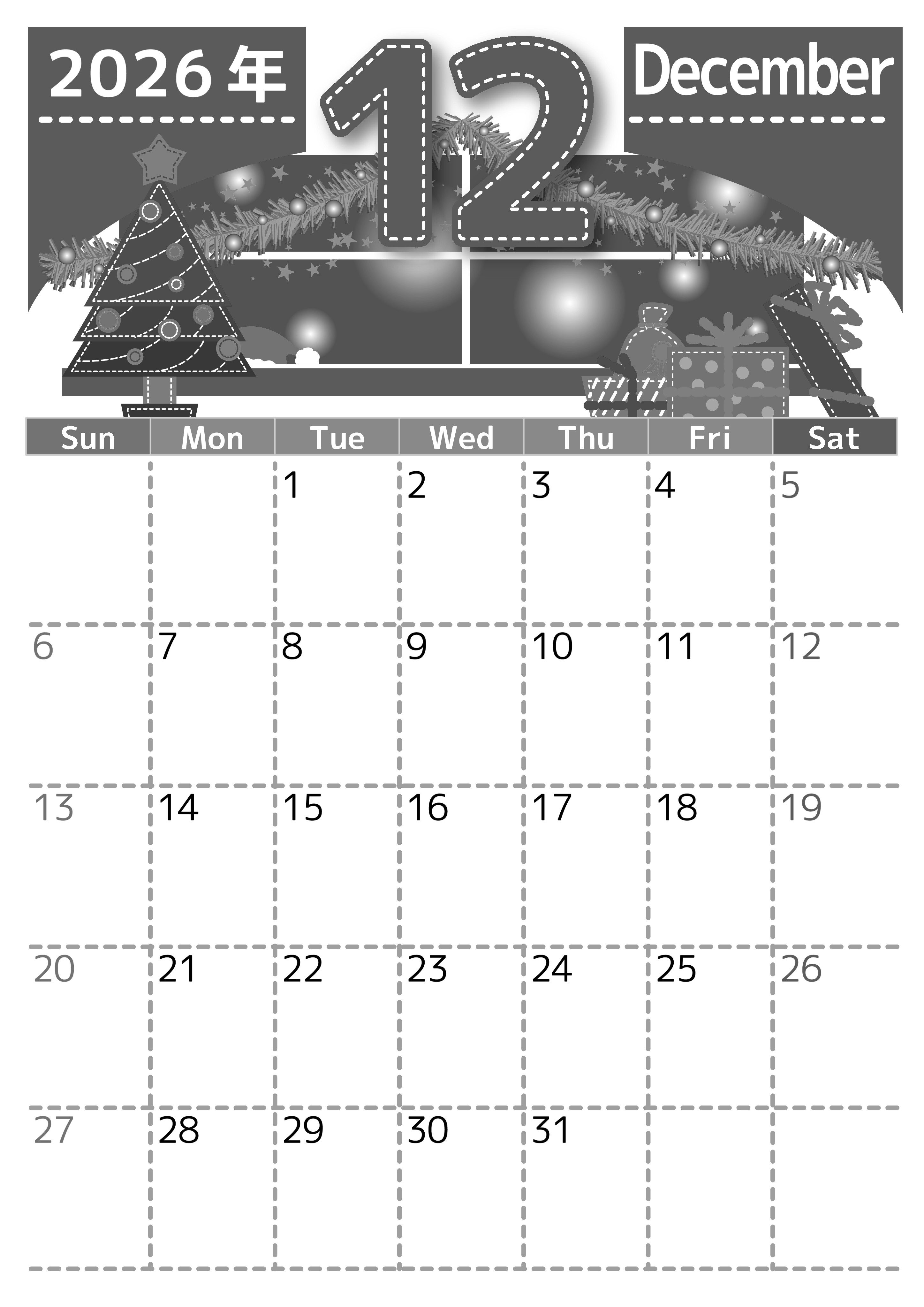 2026年12月縦型モノクロの日曜始まり クリスマスの夜イラストのかわいいA4無料白黒カレンダー(2026-00491210)