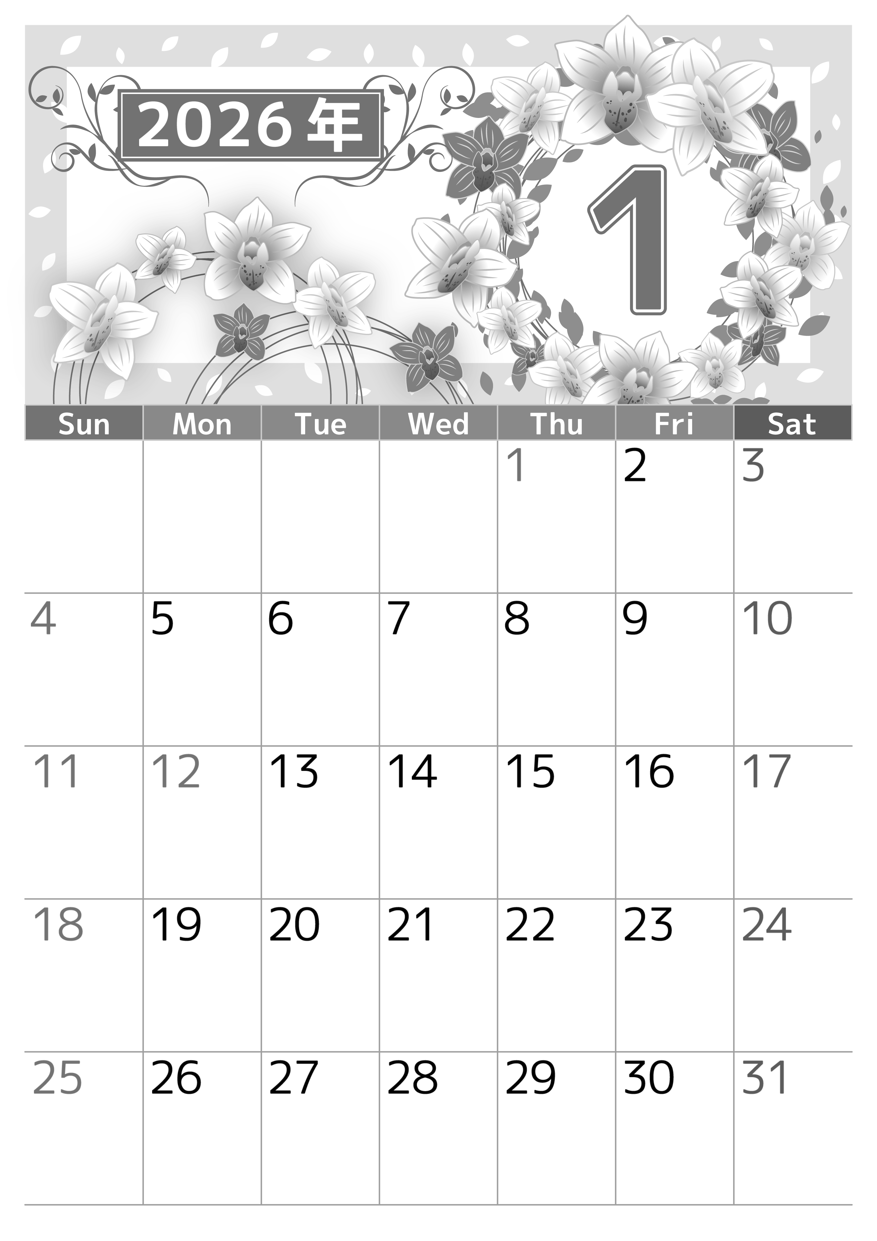2026年・無料のカレンダーテンプレート 2026年1月縦型モノクロの日曜始まり イラストのおしゃれA4無料白黒カレンダー(2026-00500110) 素材状デザイン王 2025年4月1日 2026年1月縦型モノクロの日曜始まりの無料テンプレート白黒カレンダーです。帰省や新年の始まりで多忙なスケジュールの管理に適しているおしゃれなフリー素材です。(2026-00500110) 1月 縦型のカレンダー 日曜始まり 白黒 カレンダーデザイン-0050