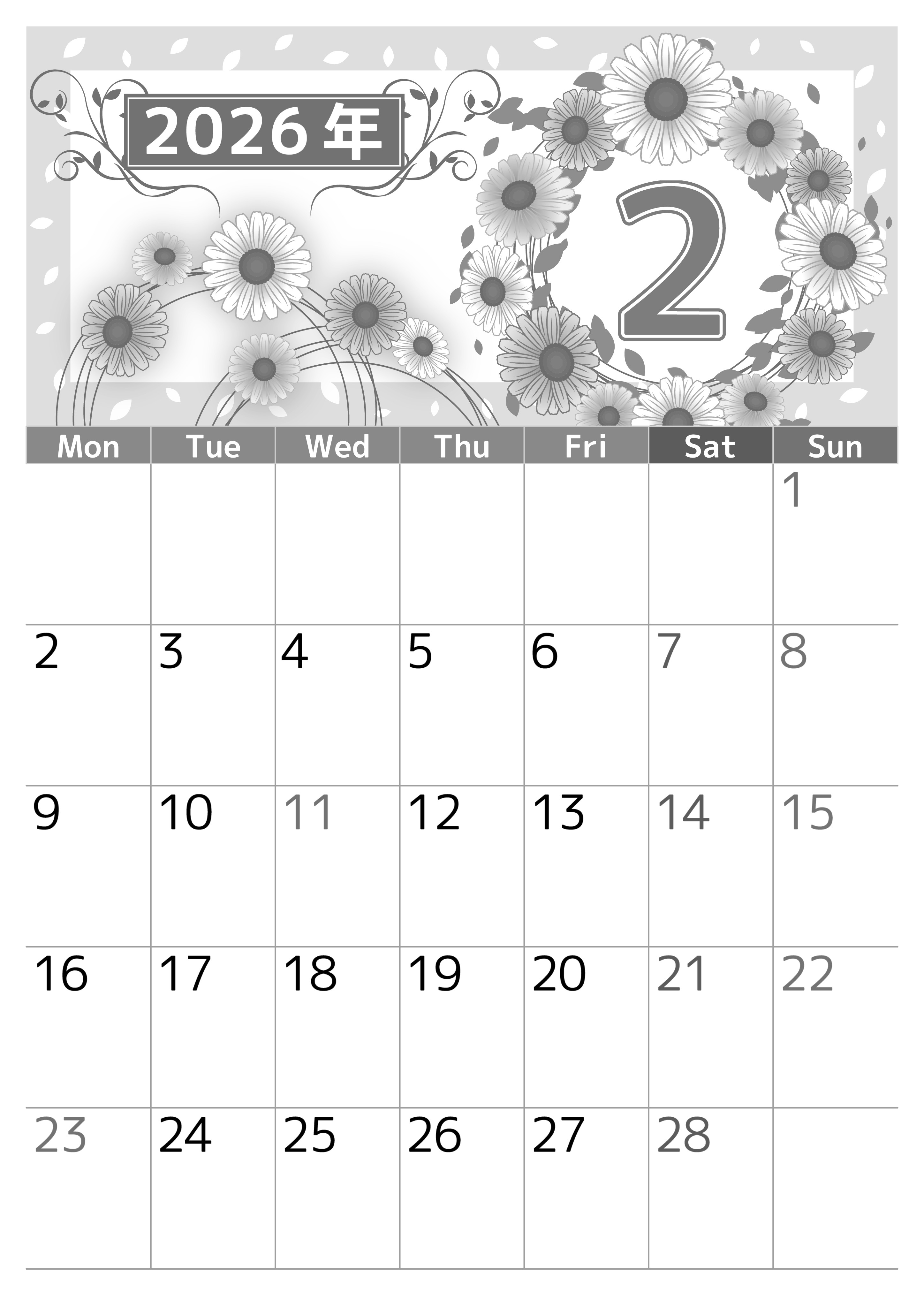 2026年・無料のカレンダーテンプレート 2026年2月縦型モノクロの月曜始まり イラストのおしゃれA4無料白黒カレンダー(2026-00500211) 素材状デザイン王 2025年4月1日 2026年2月縦型モノクロの月曜始まりの無料テンプレート白黒カレンダーです。真冬の寒さを吹き飛ばしてくれるようなおしゃれフリー素材をおすすめします。(2026-00500211) 2月 縦型のカレンダー 月曜始まり 白黒 カレンダーデザイン-0050