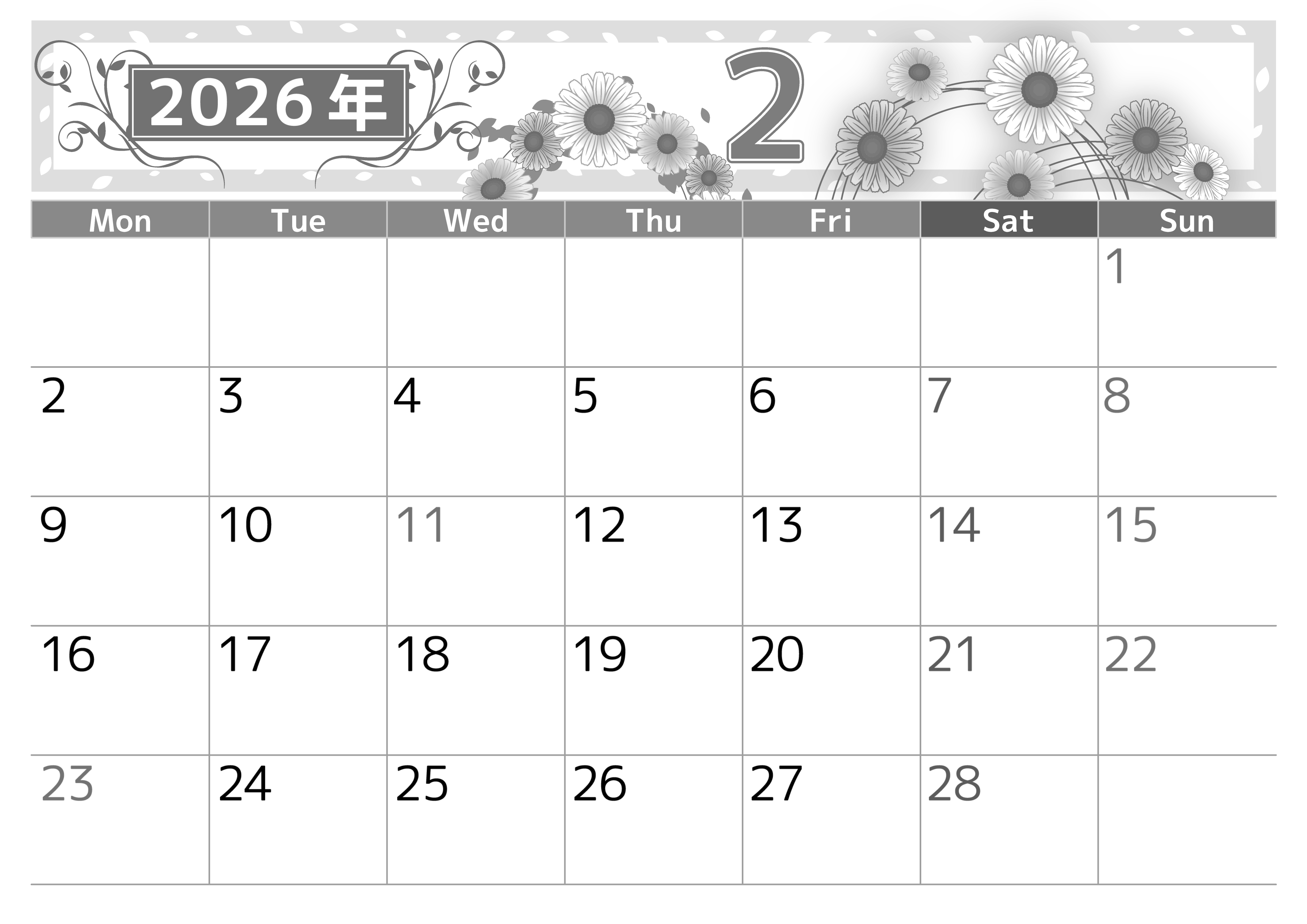 2026年・無料のカレンダーテンプレート 2026年2月横型モノクロの月曜始まり イラストのおしゃれA4無料白黒カレンダー(2026-00500201) 素材状デザイン王 2025年4月1日 2026年2月横型モノクロの月曜始まりの無料テンプレート白黒カレンダーです。真冬の寒くてセンチメンタルな気持ちを吹き飛ばしてくれるようなおしゃれイラストデザインです。(2026-00500201) 2月 横型のカレンダー 月曜始まり 白黒 カレンダーデザイン-0050
