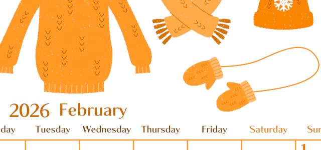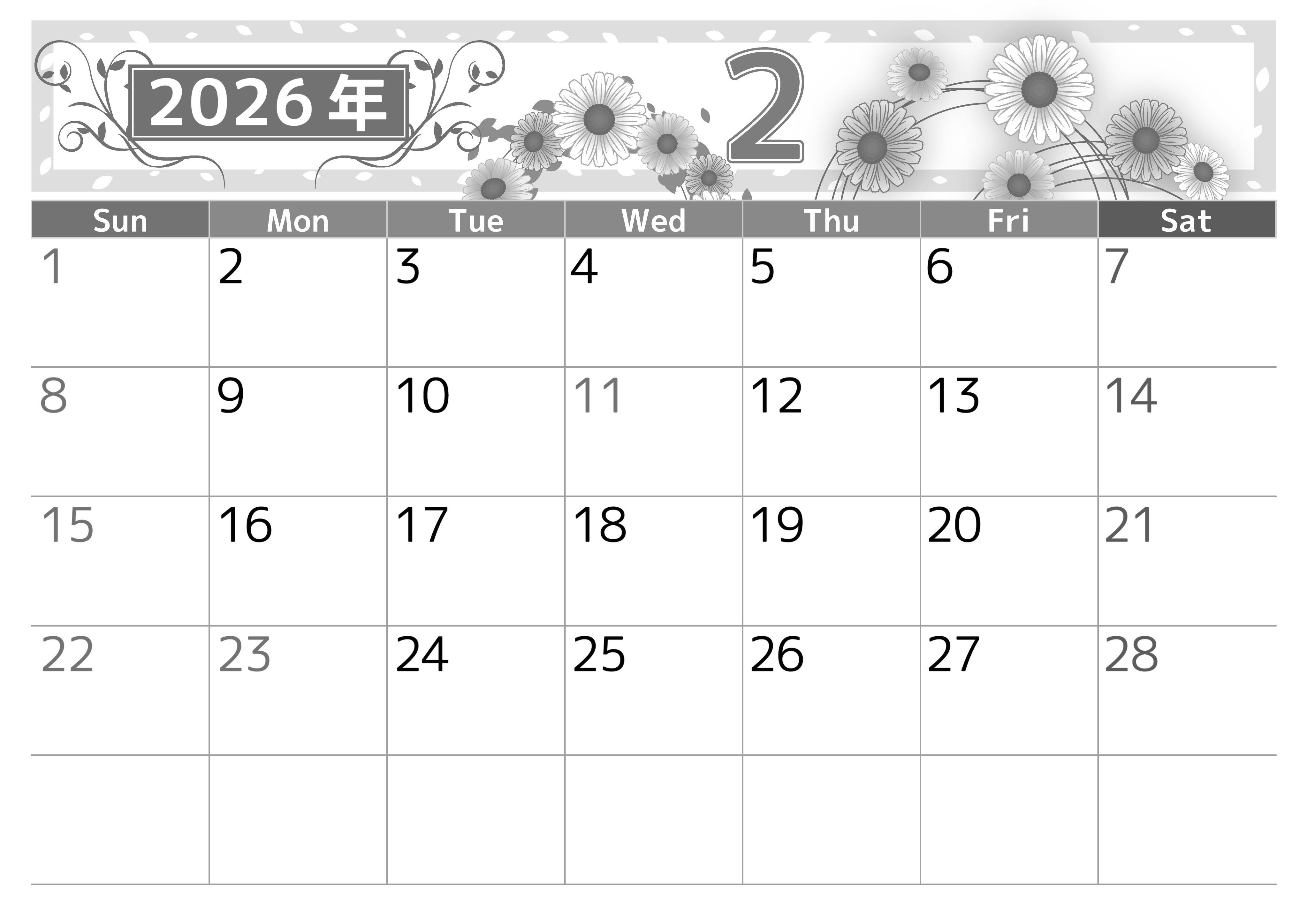 2026年2月横型モノクロの日曜始まりの無料テンプレート白黒カレンダーです。花を散りばめているイラストです。それでいてホワイトもほどよく配色しているのでくどくなりすぎていない丁度いい白黒カレンダーです。(2026-00500200)